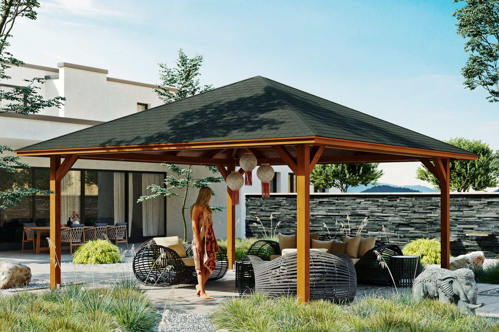 Das Dach wird mit 20 mm starker Dachschalung zur Eindeckung mit Dachschindeln geliefert (Dachschindeln sind als Zubehör optional bestellbar).