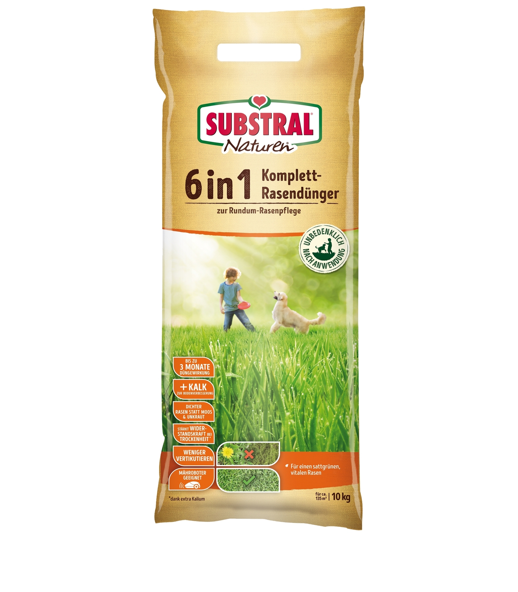 Der Substral Naturen 6in1 Komplett-Rasendünger wurde für Hobbygärtner entwickelt, die ein hochwertiges Produkt zur ganzjährigen Rundum-Rasenpflege wünschen, ohne dabei Kompromisse bei der Düngewirkung, der Anwendungssicherheit und einer einfachen Handhabung machen zu müssen. Die innovative 6in1 Düngerformulierung überzeugt durch: Sofort- & 3 Monate Langzeitwirkung. Die Kombination aus organischen und mineralischen Nährstoffen sorgt rasch und langanhaltend für eine dichte, sattgrüne Grasnarbe. EXTRA Kalk zur Bodenverbesserung. Stärkung der Widerstandskraft bei Trockenheit, Frost und Rasenkrankheiten. Der im Dünger enthaltene hohe Kaliumanteil stärkt die Rasengräser und macht sie robuster – sowohl im Sommer gegen Trockenheit als auch im Winter bei Frost und Schnee. Weniger Vertikutieren. Der enthaltene organische Dünger zusammen mit dem Kalkanteil fördern das Bodenleben. Ein aktives Bodenleben hilft, Rasenfilz zu reduzieren. Dichter Rasen statt Moos und Unkraut. Substral Naturen 6in1 Komplett-Rasendünger eignet sich aufgrund seiner breiten Wirkung ideal zur ganzjährigen Rundum-Versorgung und verhilft so zu einem dichten, vitalen Rasen statt Moos und Unkraut. Das im Dünger enthaltene Magnesium und Eisen sorgen darüber hinaus für eine satte Grünfärbung. Mähroboter- und Streuwagen-Eignung. Gleichmäßiges und praktisch staubfreies Granulat für eine saubere Ausbringung und bequeme Handhabung.