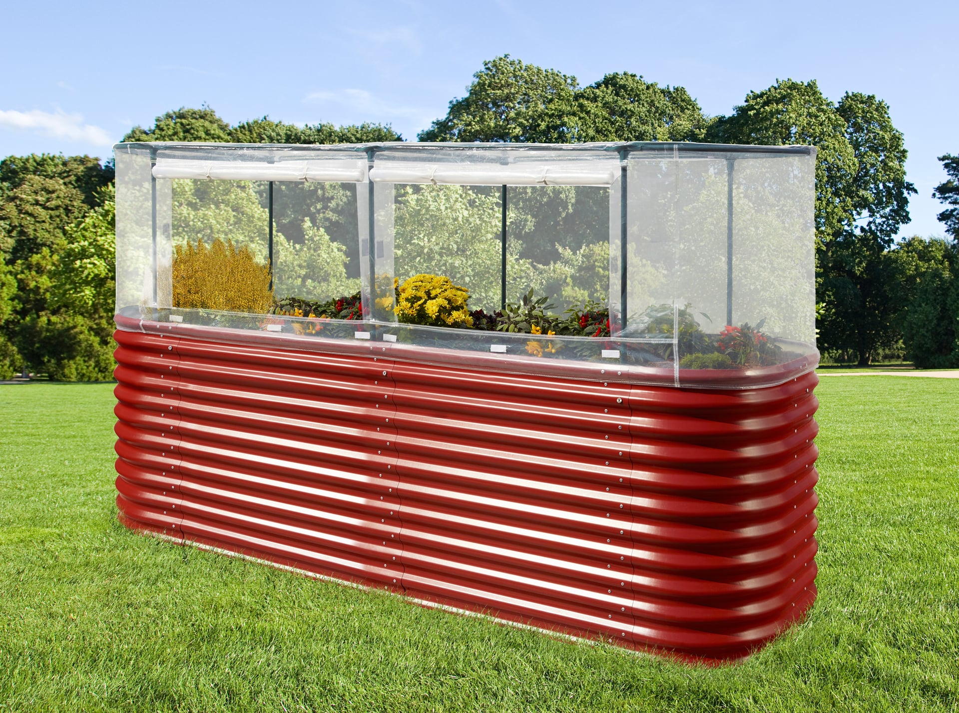 Schützen Sie Ihre Pflanzen im Handumdrehen zuverlässig vor Schädlingen und Niederschlag: Die PE-Folie mit integriertem UV-Schutz ist mit Klettverschlüssen am Gestänge befestigt, das einfach in die Erde gesetzt wird. Die Folie wird am unteren Rand über das Hochbeet gespannt.