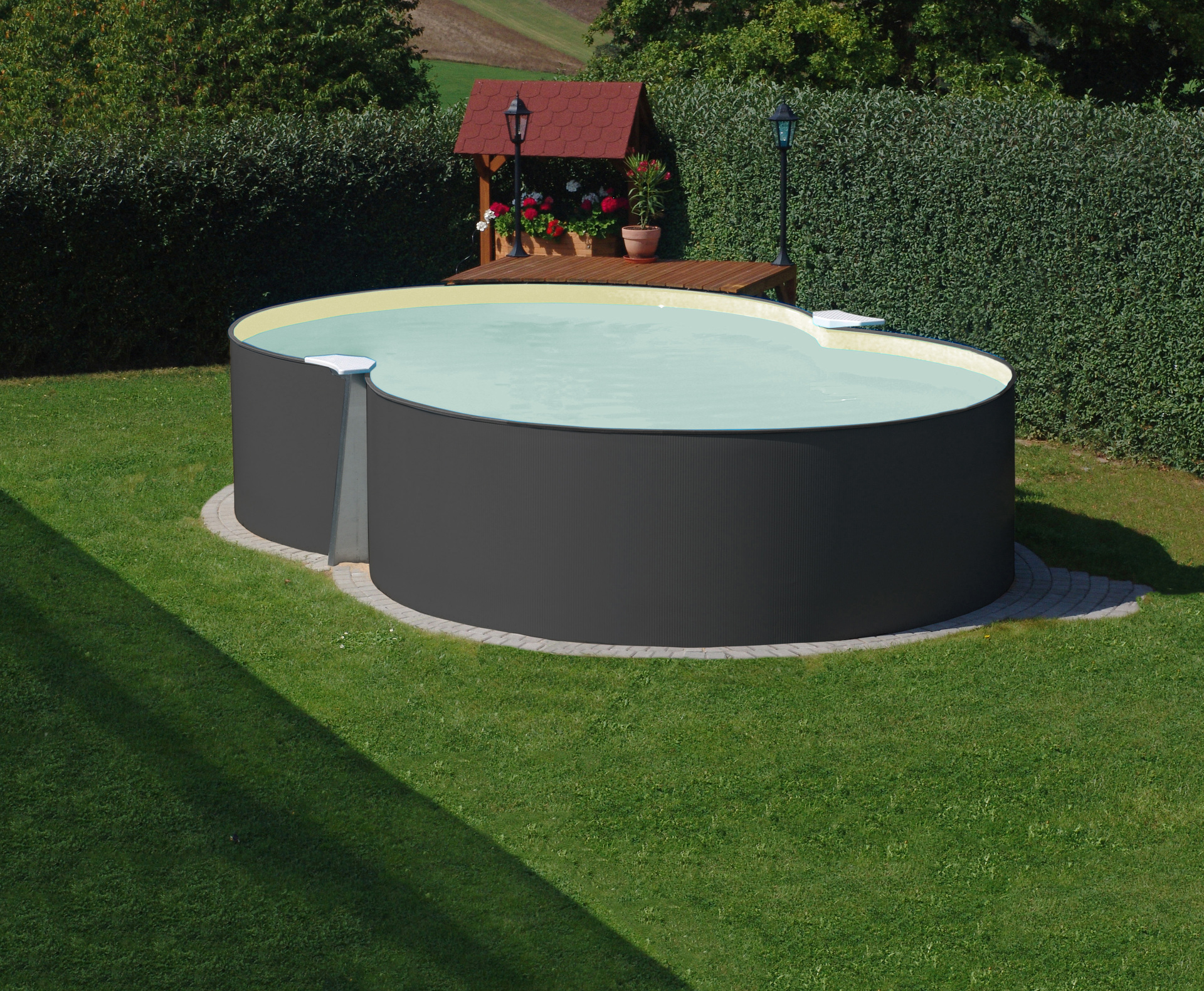Achtform-Pool für den Erdeinbau und Teileinbau. Mit 0,4 mm starker galvanisch verzinkter Stahlwand und 0,4 mm starke sandfarbene Innenfolie mit Einhängebiese.