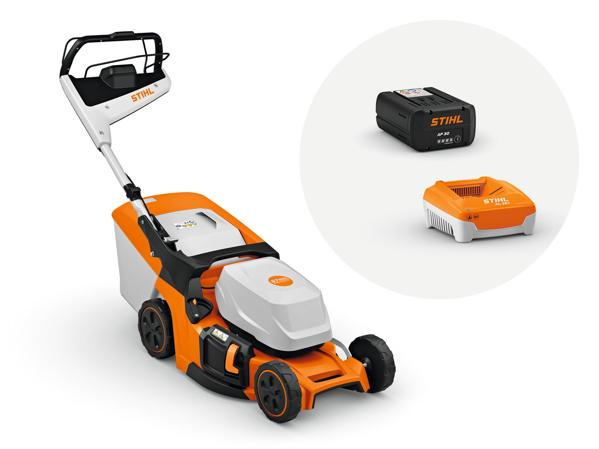 Der Akku-Rasenmäher STIHL RMA 448 PV mit Vario-Radantrieb und 46 cm Schnittbreite erleichtert Hobbygärtnern und Hobbygärtnerinnen das Mähen von mittelgroßen Rasenflächen und Hanglagen . Besitzen Sie noch keine Akkus aus dem STIHL AP-System, empfiehlt es sich, den STIHL RMA 448 PV direkt im Set zu kaufen. Das Set beinhaltet einen Akku STIHL AP 30 und das Ladegerät STIHL AL 301. Dank serienmäßiger Ausstattung mit Multi-Messer, integrierter Mulchfunktion und Seitenauswurf eignet sich dieser Rasenmäher sowohl zum Mähen als auch zum Mulchen. Sie können die Arbeitsgeschwindigkeit über das Bedienelement am digitalen HMI individuell zwischen 0 km/h und 4,6 km/h einstellen . Der Eco-Modus passt die Motorleistung automatisch an das benötigte Leistungsniveau an, während Sie arbeiten. Dank der sequenziellen Entladung sorgt der RMA 448 PV außerdem dafür, dass automatisch auf den zweiten mitgeführten Akku aus dem STIHL AP-System umgeschaltet wird, sobald der erste leer ist. Das manuelle Wechseln der Akkus entfällt also und Sie können auch größere Rasenflächen sehr effizient mähen. Gleichzeitig unterstützen die strömungsoptimierten Messer einen sparsamen Energieverbrauch. Um ihren Rasen in Form zu bringen, können Sie die Wunschlänge Ihres Rasens über die zentrale Schnitthöhenverstellung beim STIHL RMA 448 PV in 7 Stufen von 20 mm bis 100 mm einstellen. Während des Mähens fängt der klappbare Grasfangkorb mit 52 l Volumen zuverlässig das Schnittgut auf und lässt sich im Anschluss leicht entleeren. Dank des höhenverstellbaren Komfortlenkers genießen Sie auch bei längeren Mäheinsätzen einen hohen Arbeitskomfort. Um den Rasenmäher kompakt zu verstauen, lässt sich der Lenker einfach einklappen . In unserer Übersicht zu den STIHL Akku-Lauf- und Ladezeiten können Sie sehen, wieviel Rasenfläche Sie mit einer Akkuladung Ihres STIHL Akku-Rasenmähers RMA 448 PV bearbeiten können und wie lange der eingesetzte Akku zum Laden benötigt. Bitte beachten Sie für eine optimale Nutzung zusätzlich auch unsere Geräte-Akku-Kompatibilitätsübersicht.
