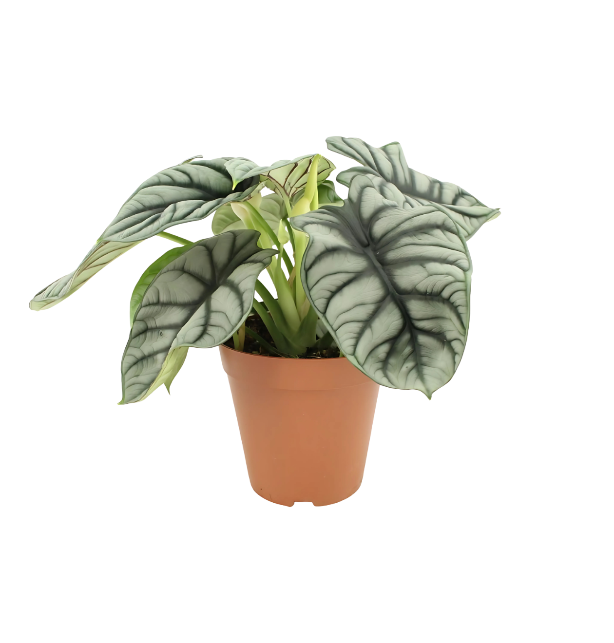 Die Alocasia “Silver Dragon” ist ein echtes Kunstwerk der Natur und wirkt wie aus einer anderen Welt. Ihre pfeilförmigen Blätter strahlen in einem atemberaubenden silbrigen Grau, das je nach Lichteinfall dezent metallisch schimmert. Dunkelgrüne, tiefe Blattadern durchziehen die Oberfläche und erinnern an die schuppige Haut eines sagenumwobenen Drachen – daher auch ihr treffender Name. Die Textur der Blätter ist leicht samtig und verleiht der Pflanze eine faszinierende Haptik. Anders als ihre Verwandten wächst die “Silver Dragon” eher kompakt, bleibt aber durch ihre außergewöhnliche Optik stets ein Star in jeder Pflanzensammlung. Ob alleinstehend oder in Kombination mit anderen Zimmerpflanzen – sie wird garantiert zum Mittelpunkt jeder grünen Oase.
