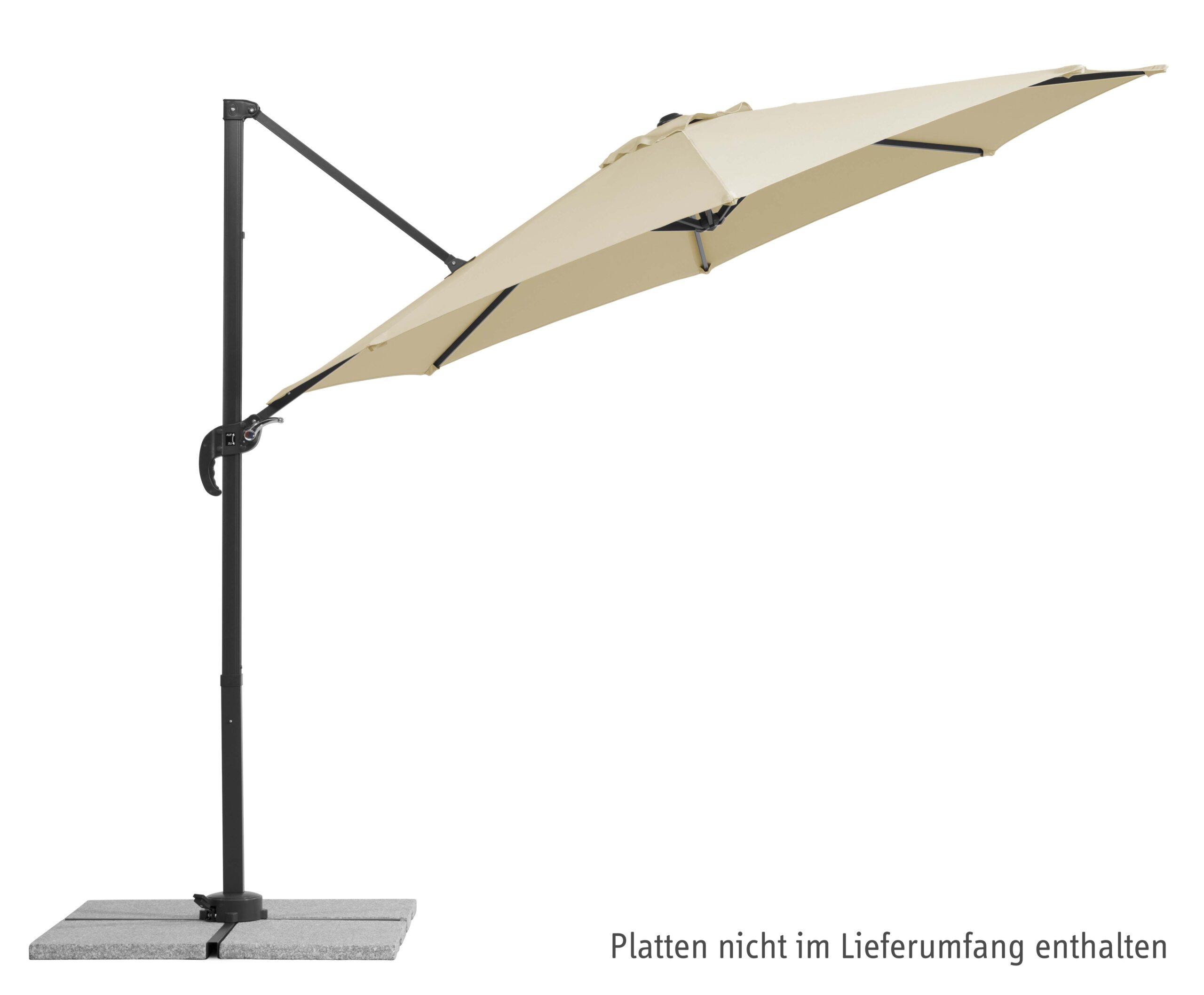 Im Lieferumfang enthalten ist ein Plattenständer für 4 Wegeplatten inder Größe 50x50x5 cm (Platten nicht enthalten), welcher dem Schirmeinen sehr stabilen Halt gibt.
