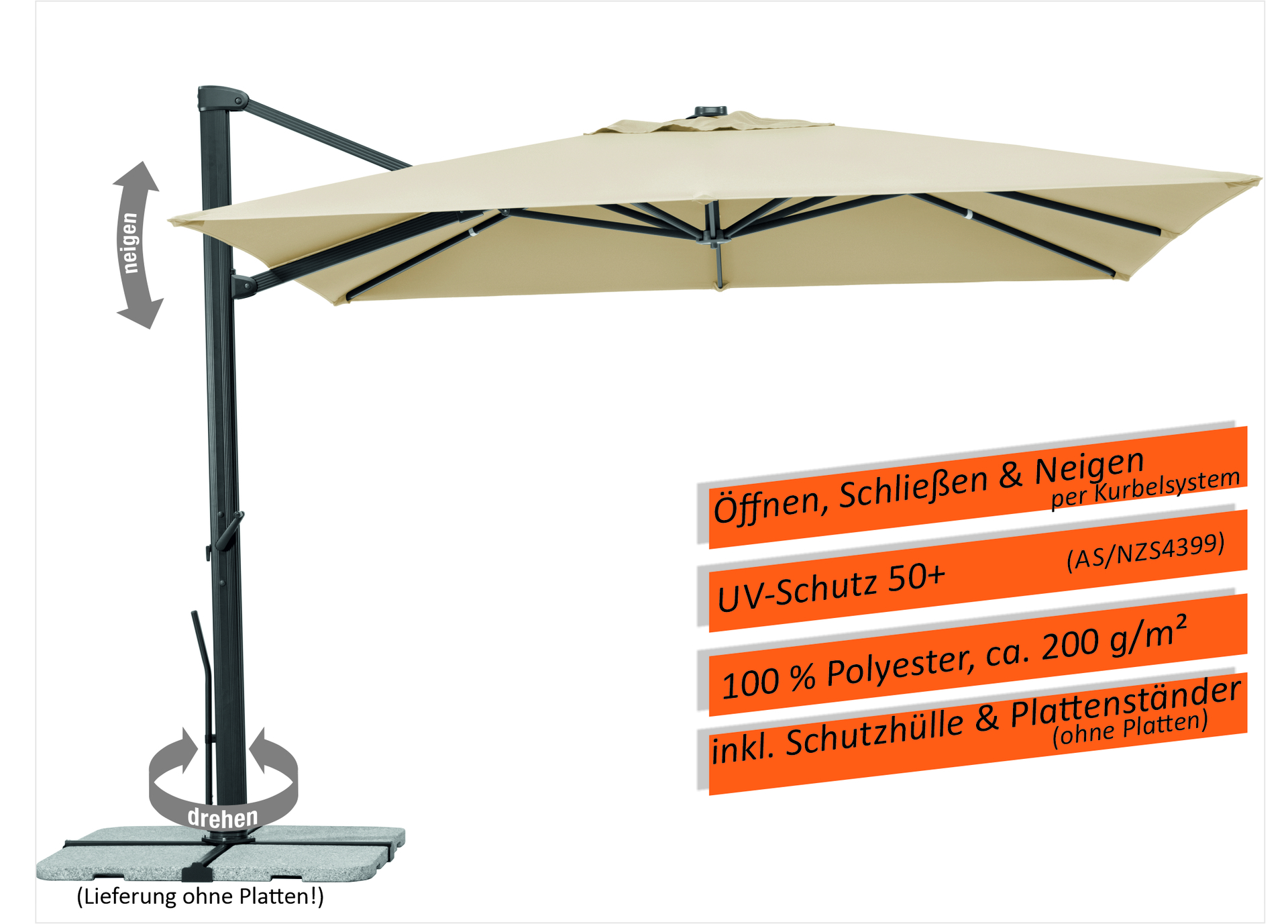 Der Ampelschirm wird inklusive lichtundurchlässiger Schutzhülle mit Reißverschluss und Stab geliefert, somit ist Ihr Schirm vor äußeren Einflüssen geschützt und Sie haben länger Freude daran. Durch den Stab ist das Überziehen der Schutzhülle sogar bei aufgestelltem Schirm ein Kinderspiel.