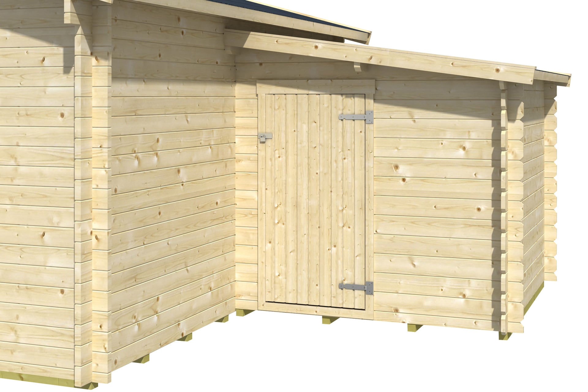 Praktischer SKAN HOLZ Anbauschuppen passend zu 45plus und 70plus Blockbohlenhäusern. Rechts, links oder hinten frei zu positionieren.