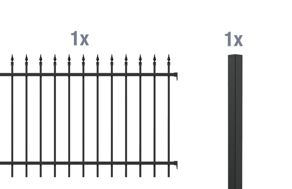 1 Zaunfeld Chaussee, Aluminium, matt schwarz, 2000×1200, 1 Zaunpfosten Chaussee, Circle, Aluminium, schwarz, zum Einbetonieren51x51/1700