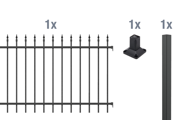 1 Zaunfeld Chaussee, Aluminium, matt schwarz, 2000×1200, 1 Zaunpfosten Chaussee, Circle, Aluminium, schwarz, zum Einbetonieren51x51/1700, 1 Pfostenträger Chaussee, Circle, Aluminium, schwarz, zum Aufschrauben,