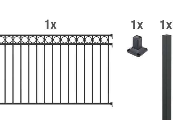 1 Zaunpfosten Chaussee, Circle, Aluminium, anthrazit, zum Einbetonieren51x51/1500, 1 Pfostenträger Chaussee, Circle, Aluminium, anthrazit, zum Aufschrauben,, 1 Zaunfeld Circle, Aluminium, anthrazit, 2000×1000