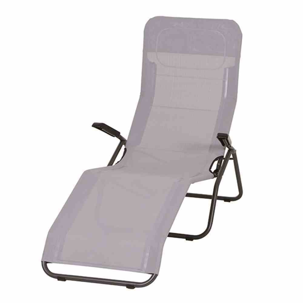 – Ausführung: Sonnenliege, – Farbe Bezug: grau, – Maße: 144×72,5×103,5cm, – Material: Stahl, – Stapelbar: Nein, – zusammenklappbar: Ja