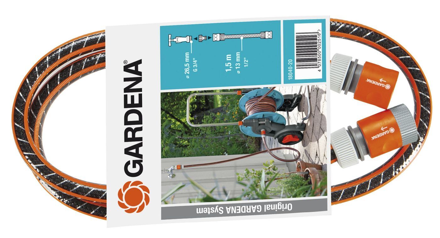 Zum Anschluss der Schlauchwagen/-trommeln an den Wasserhahn. 1,5m Comfort FLEX Schlauch, 13 mm (1/2“), komplett bestückt mit Original GARDENA Systemteilen: 1 x Hahnstück, 2 x Schlauchstück.”