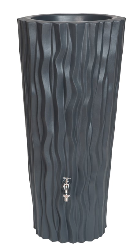 Die Regentonne „Alana“ besticht durch ihre moderne schlichte Form mit einzigartiger Oberflächenstruktur. Sie verfügt über eine fest integrierte Pflanzkammer, die eine individuelle Bepflanzung ermöglicht.