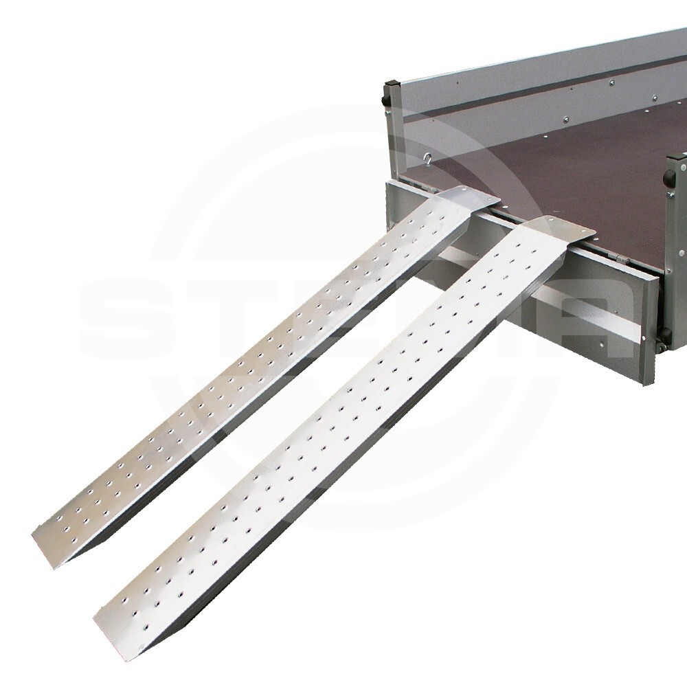 Die verzinkten Rampen dienen dem Auffahren von z. B. einem Rasenmäher oder einem Quad auf Ihren PKW-Anhänger. Für das Einhängen sind in den Holzboden, je nach Wunschposition, zwei Bohrungen pro Rampe vorzunehmen. Die Rampe misst eine Länge von 149 cm und eine Breite von 20 cm. Sie ist mit 300 kg belastbar. Im Lieferumfang sind die passenden Normteile sowie die Montageanleitung enthalten.