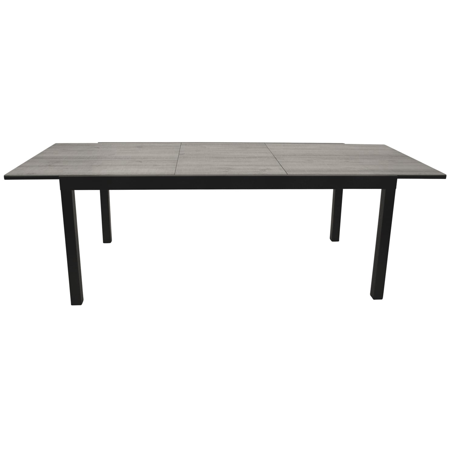 Großer Ausziehtisch. Gestell Aluminium dunkelgrau pulverbeschichtet, Tischplatte Glas in Keramikoptik grau. Ausziehbar von 200cm auf 300cm.