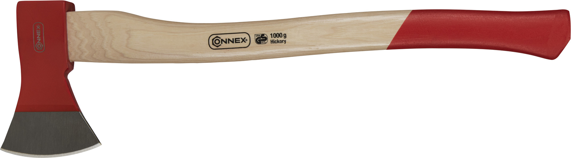 Axt 1000 g mit Hickory-Holzstiel nach DIN 7294-B Stahl geschmiedet, Schneide poliert, 3-fach verkeilt, mit Schneidenschutz, Stiellänge 600 mm, in Kuhfußform