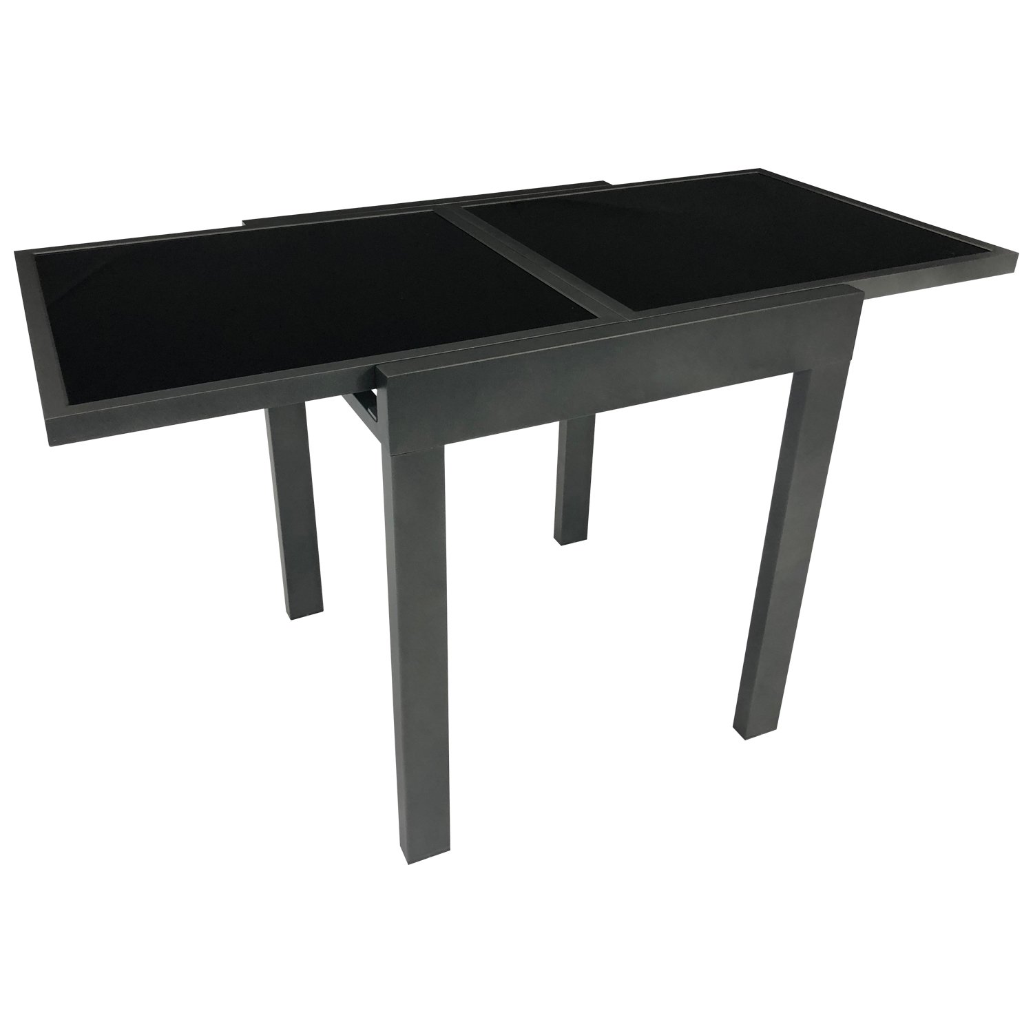 Der Balkon – Ausziehtisch ist quadratisch, verfügt über ein Gestell aus Aluminium und eine Tischplatte aus Glas.