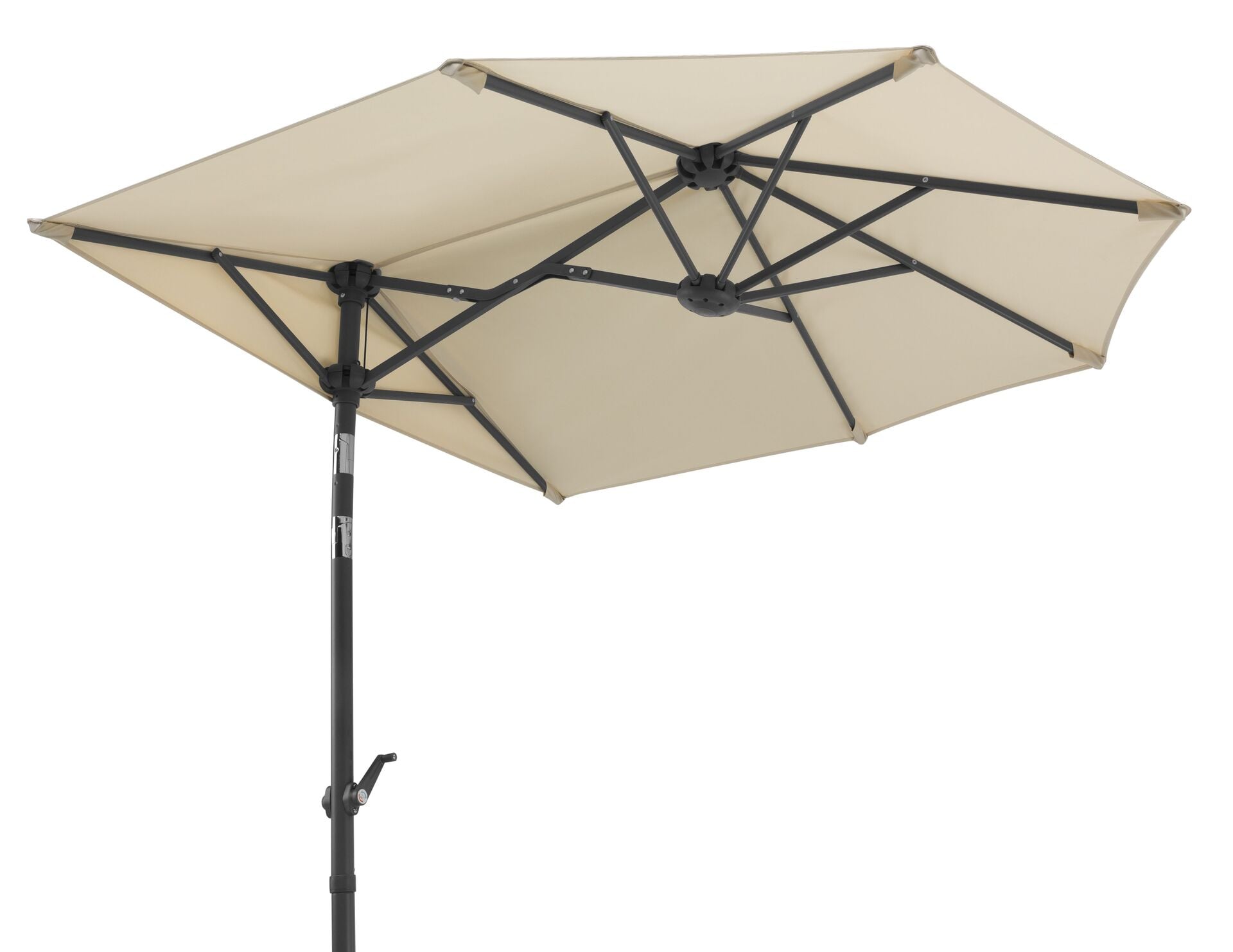 Das Stahlgestell hat eine anthrazitgraue Pulverbeschichtung. Der Stock hat einen Durchmesser von ca. 38 mm und ist 2-teilig, wodurch Sie den Schirm problemlos auseinanderbauen und über den Winter platzsparendeinlagern können. Mithilfe der integrierten Kurbel lässt sich der Schirm ohne großen Kraftaufwand öffnen und schließen.