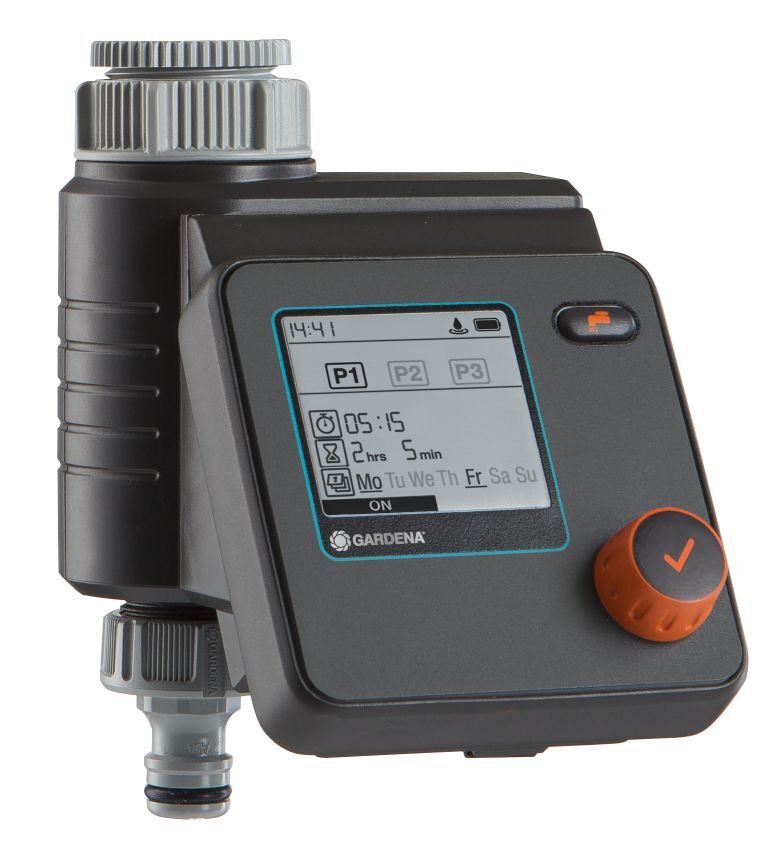 Mit der GARDENA Bewässerungssteuerung Select lässt sich die Bewässerung flexibel und individuell planen. Für die Bewässerung lassen sich drei unterschiedliche und voneinander unabhängige Zeitpläne erstellen. Einstellbar sind Start, Dauer und Wochentage der Bewässerung. Die Steuerung ist batteriebetrieben, wird direkt an den Wasserhahn angeschlossen und lässt sich leicht durch nur einen Dreh- und Drückschalter zur Auswahl der Daten und zur Bestätigung bedienen. Ein gut lesbares LC-Display zeigt alle Einstellungen auf einen Blick an. ‘Water Now‘ Funktion: Soll die Bewässerung einmal sofort gestartet werden, lässt sich diese manuell aktivieren, ohne das Gerät vom Wasserhahn zu entfernen oder Einstellungen zu verändern. Die Bewässerungssteuerung funktioniert durch die ‘Safe Stop‘ Technologie immer zuverlässig: Ist der Energiestand der Batterie zu gering, um einen Bewässerungsvorgang komplett zu steuern, wird er gar nicht erst gestartet. Die Batterieanzeige im Display weist rechtzeitig darauf hin, wenn die Batterie ausgetauscht werden muss. Die wetterbeständige Bedieneinheit ist abnehmbar. Der Einsatz in Kombination mit einem GARDENA Bodenfeuchtesensor ist möglich.GARDENA gewährleistet höchste Qualität durch die Auszeichnung “Made in Germany”. Dieses Produkt garantiert für eine effiziente Bewässerung, denn jeder Tropfen zählt.
