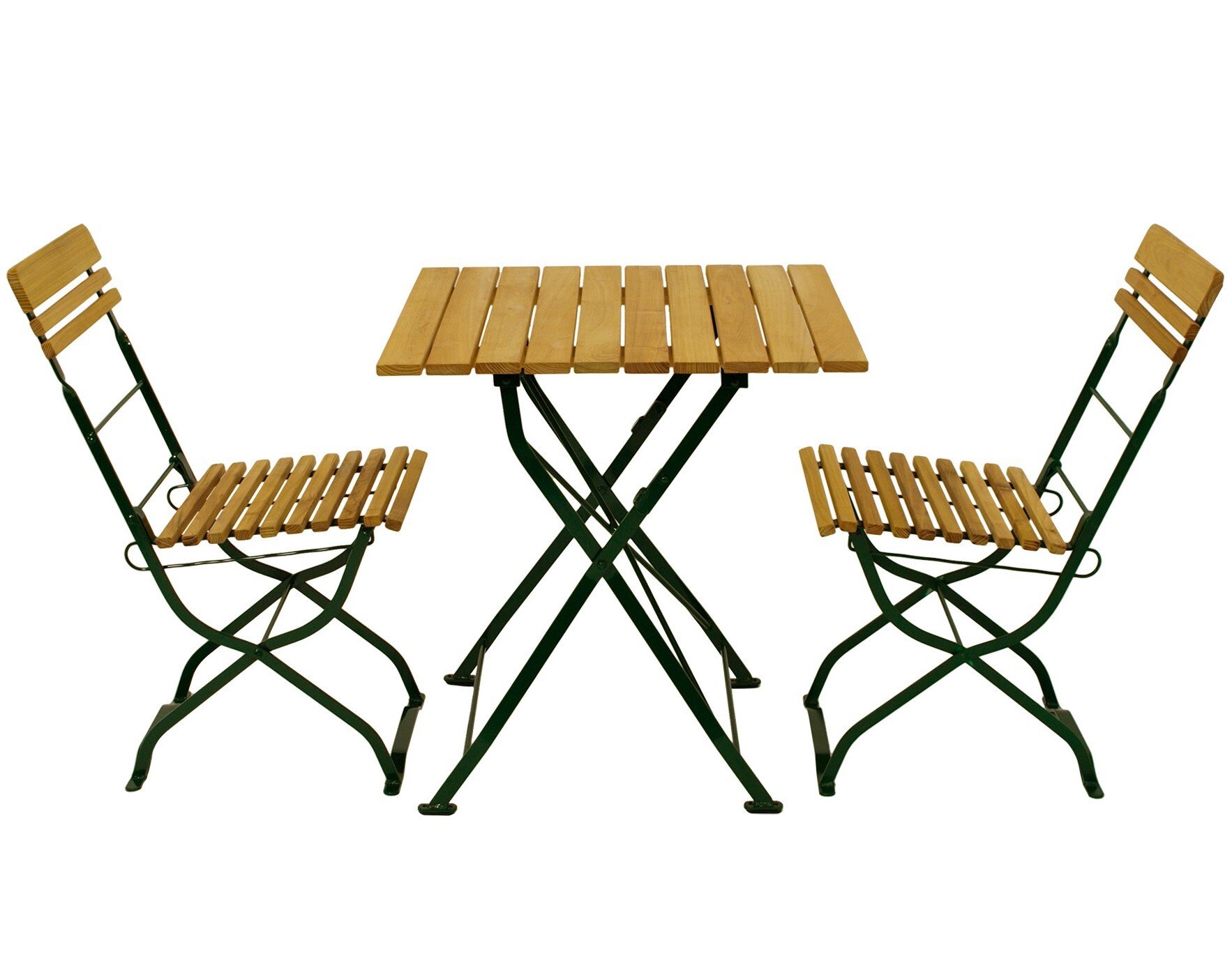 Die 3-teilige Biergarten – Garnitur besteht aus zwei Stühlen und einem Tisch. Diese Sitzgruppe ist klappbar und kann so sehr platzsparend verstaut.