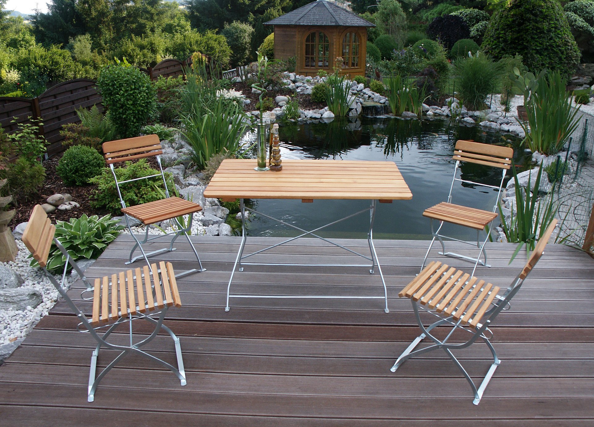 Biergarten – Garnitur 5-teilig (4x Stuhl, 1x Tisch 70x110cm rechteckig), Gestell Flachstahl verzinkt + transparent pulverbeschichtet, Latten Robinie, klappbar
