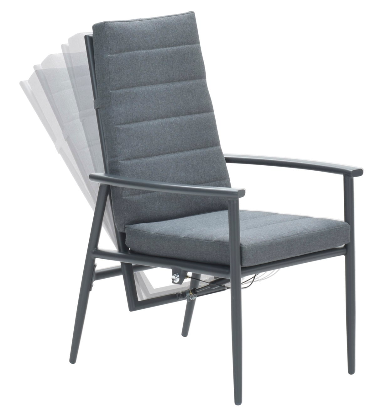 Der Stuhl ist komplett aus Aluminium gefertigt und mit einer schützenden Pulverbeschichtung versehen. Aluminium ist pflegeleicht und leicht. Der Stuhl kommt mit einem Sitz- und Rückenkissen und hat eine verstellbare Rückenlehne, die Sie von der Seite des Stuhls bedienen können, die Gasfeder sorgt zusätzlich dafür, dass Sie sich wunderbar entspannen können.