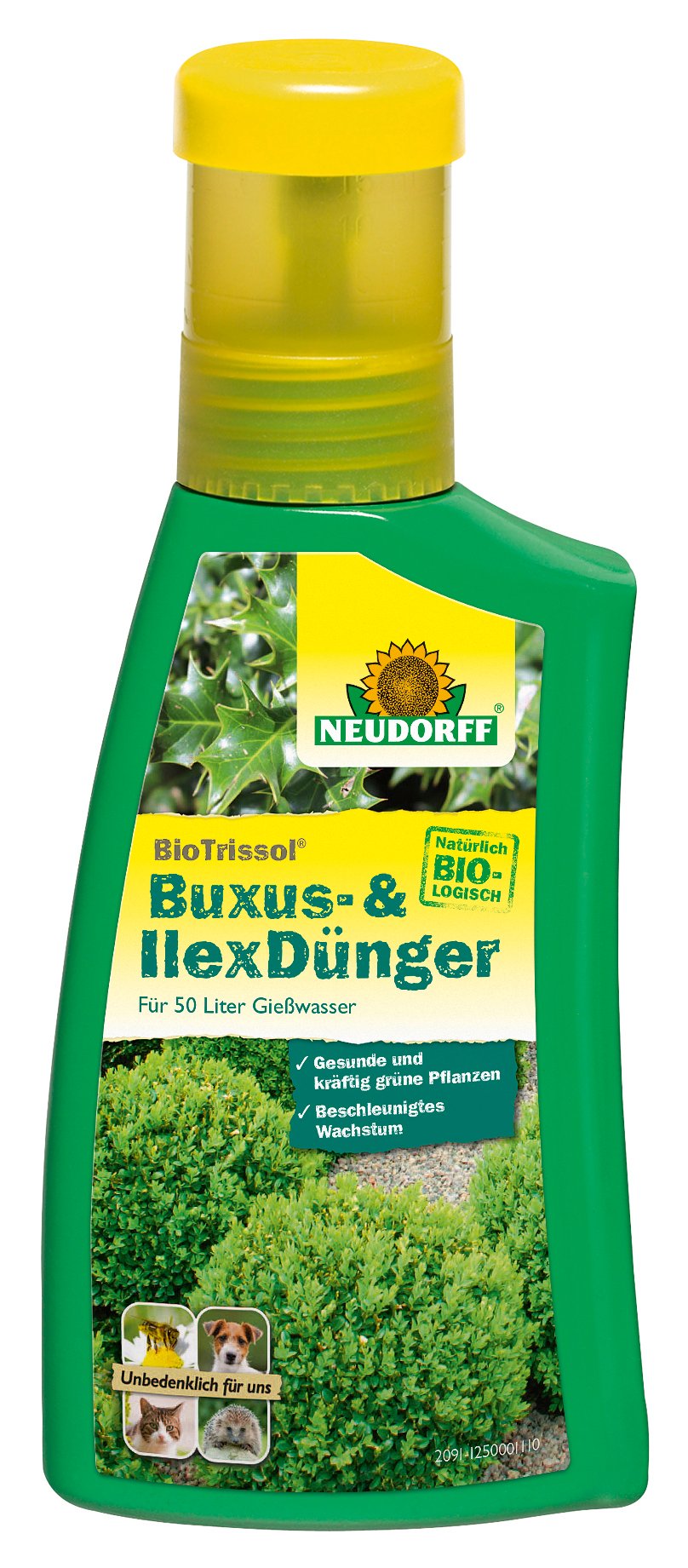 Organischer NPK-Dünger flüssig 3-1-5 mit Schwefel für alle Buchsbaumpflanzen im Garten und auf Terrasse und Balkon.