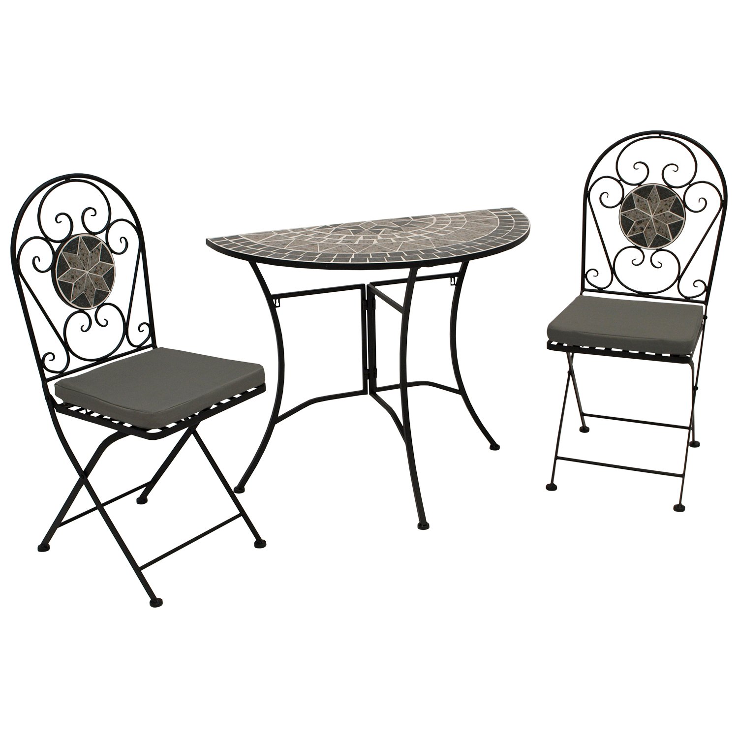 Bistroset 3-teilig (2x Klappstuhl, 1x Wandtisch 90x45cm halbrund) aus schwarz pulverbeschichtetem Eisen, Tischplatte im Mosaik-Design, Sitzfläche Kreuzmuster und Rückenfläche mit Mosaik-Verzierung in grau/weiss. Lieferung inkl. Sitzpolster in grau. Materialzusammensetzung Bezüge: 100% Polyester.