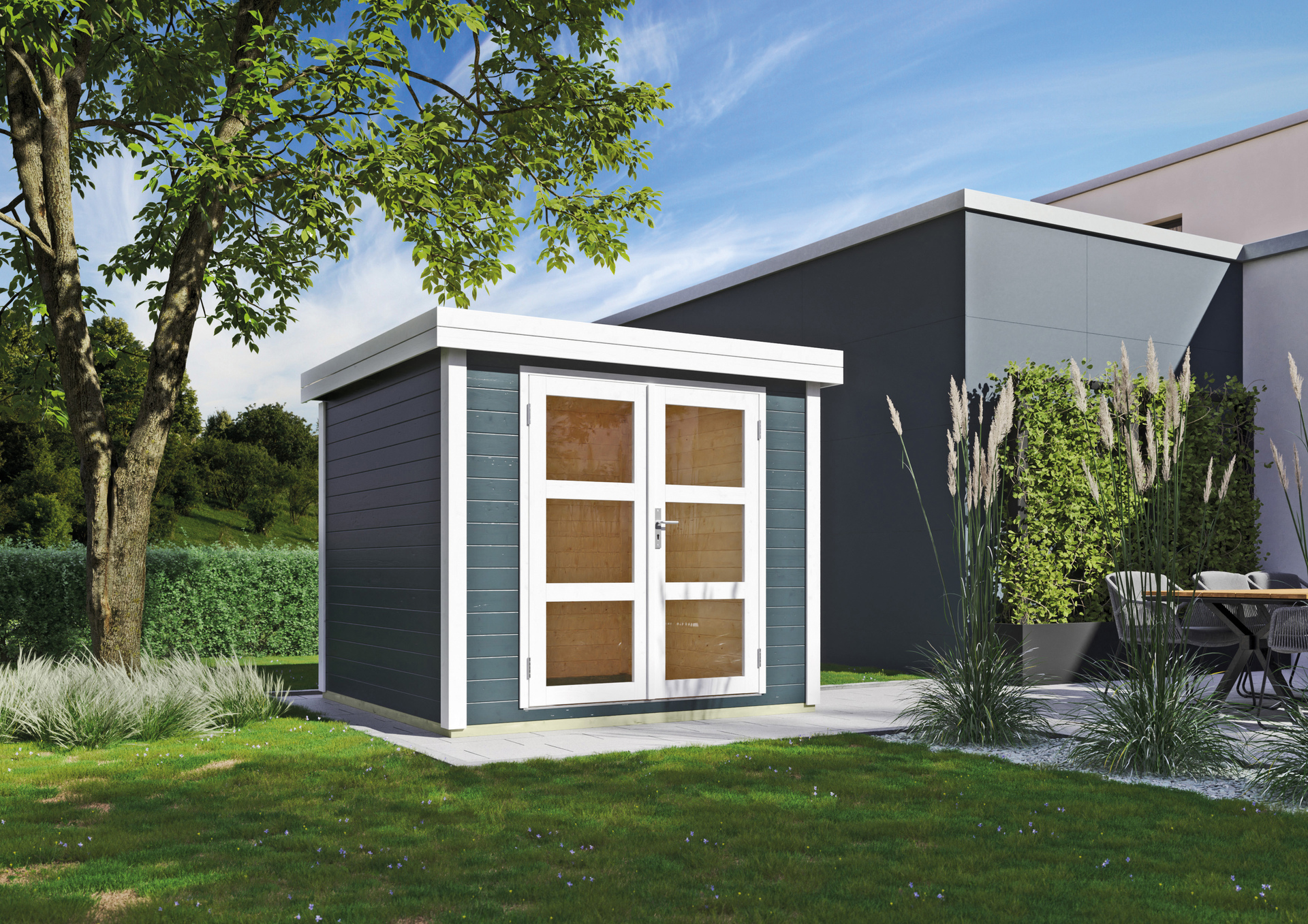 Blockbohlenhaus mit Pultdach aus Fichtenholz in anthrazit/weiß.
