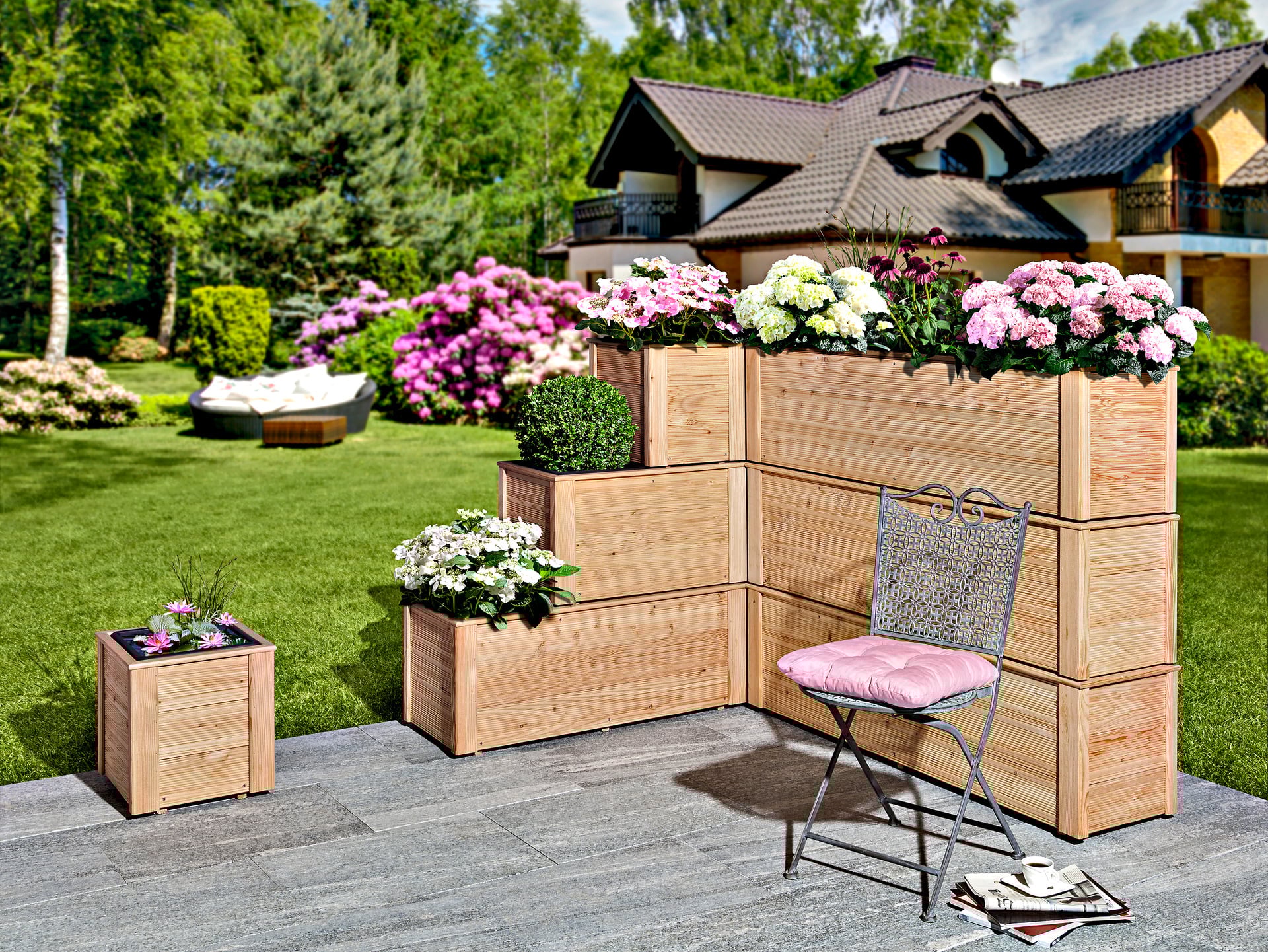 Der individuell stapelbare Blumenkasten besteht aus naturbelassenem Lärchenholz. Der Blumenkasten wird ohne Einsatz und Boden geliefert. Zusätzliche Pflanzkasteneinsätze werden benötigt.