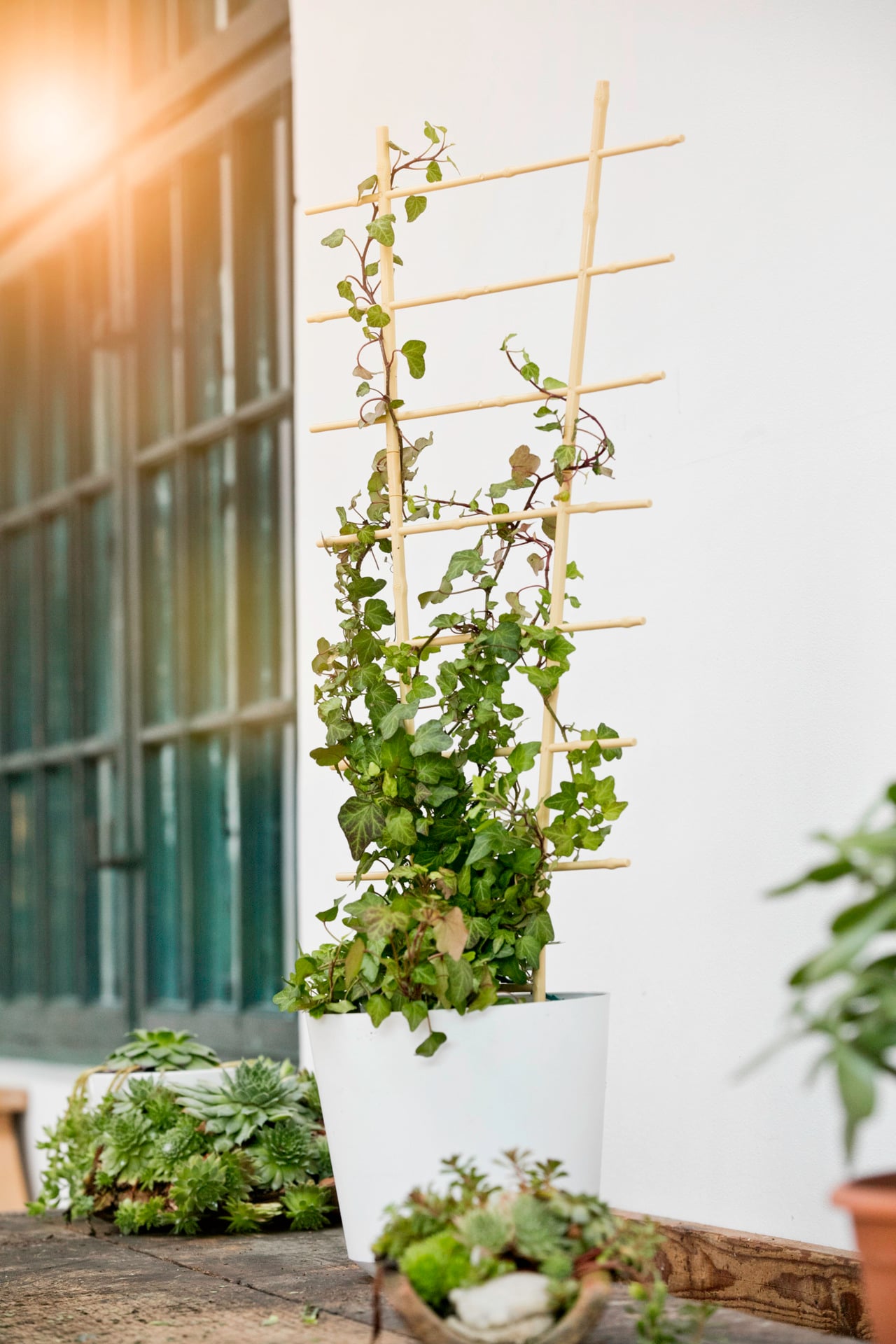 Viele rankfreudige Gemüsepflanzen und Blumen freuen sich über ein Klettergerüst, an dem sie emporwachsen können. Schlicht im Design, aber als wirkungsvoller Helfer präsentiert sich das Bambus Gitterspalier in verschiedenen Größen. Bambusrohre sind zäh und wetterfest, daher kann das Stützgitter auch im Garten seine Dienste verrichten. Es wird einfach in die Erde zu den Pflanzen gesteckt – egal ob direkt ins Beet, Hochbeet oder in einen Pflanztopf. Efeu, blaue Prunkwinde, Lilie, Clematis, aber auch Tomaten, Gurken & Co können ungestört ranken und gedeihen.