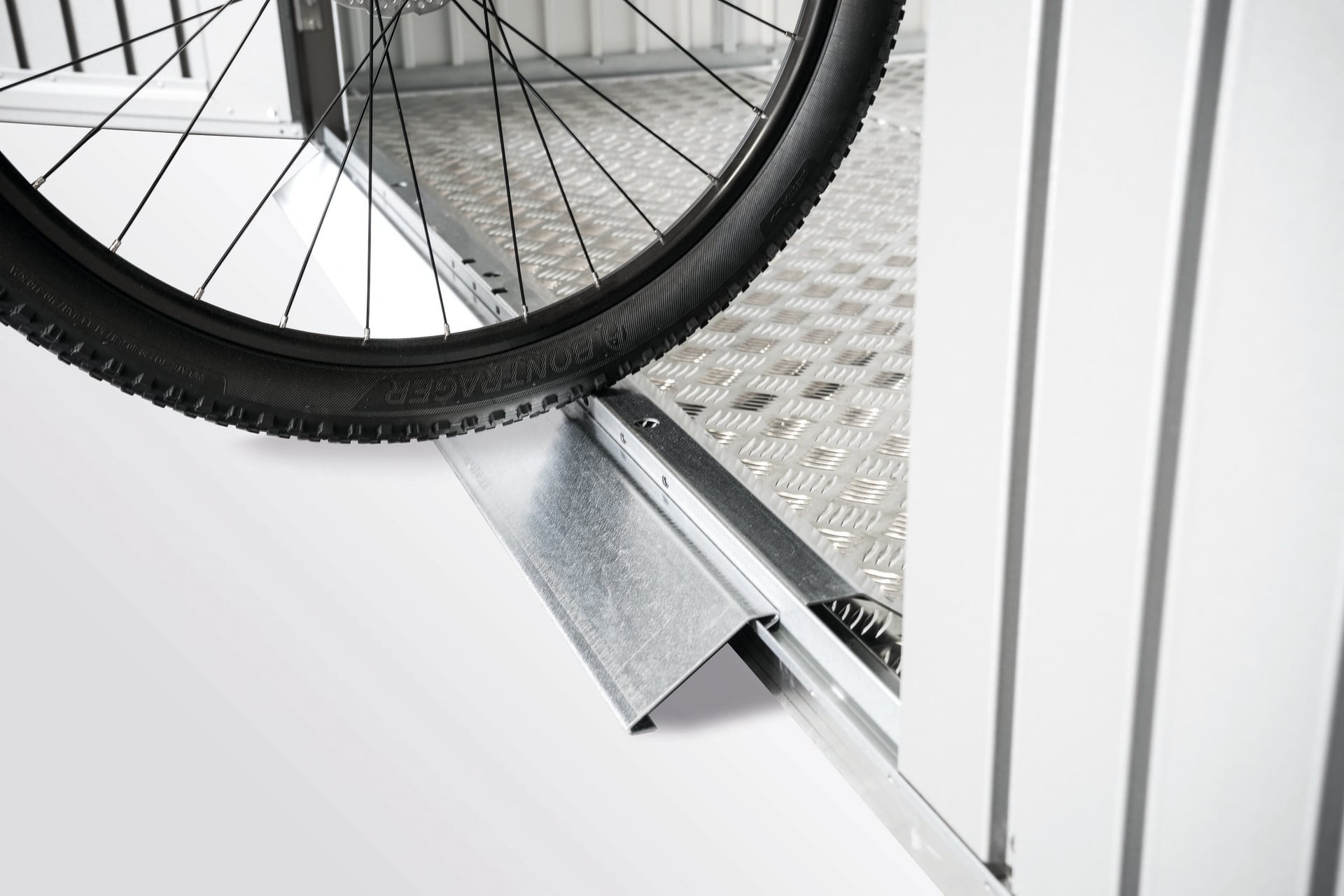 Für das bequeme Überfahren mit schweren Geräten, Zweiteilig, für die Innen- und Außenseite, nur bei ALU-Bodenrahmen und Doppeltür möglich, kann nicht gemeinsam mit dem SmartBase-Fundament und SmartBase PLUS-Fundament verwendet werden