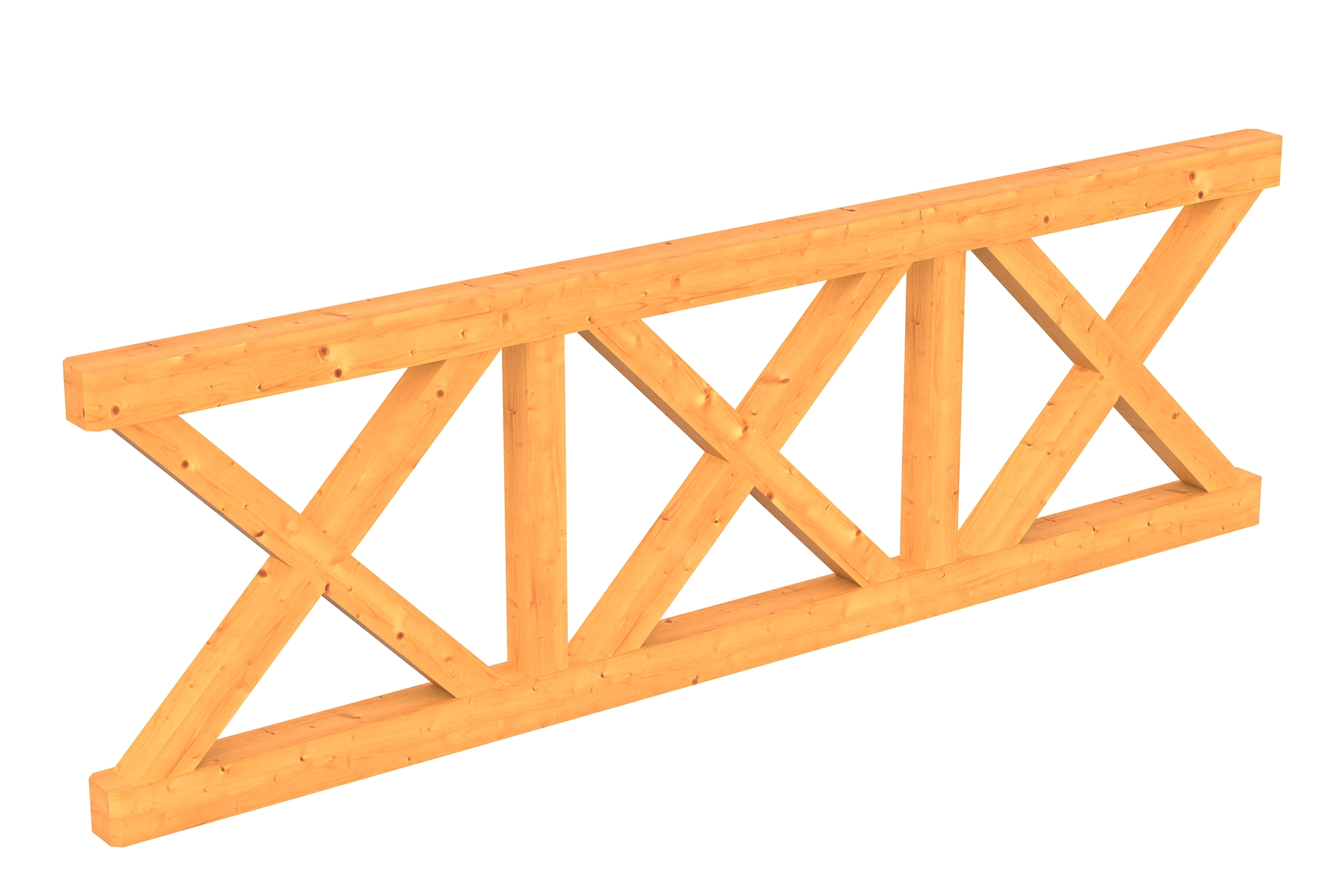 Die dekorative SKAN HOLZ Brüstung mit massiven Andreaskreuzen Douglasie eignet sich für SKAN HOLZ Terrassenüberdachungen aus Douglasie mit einem Pfostenabstand von 270 cm.
