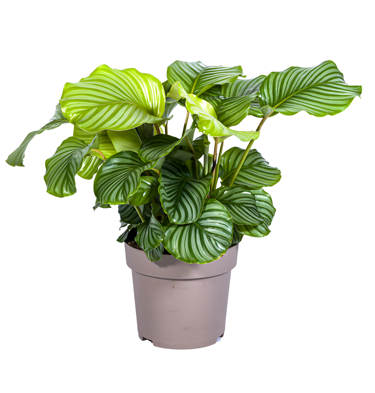 Die Calathea “Orbifolia” ist bekannt für ihre großen, runden Blätter, die mit hell- und dunkelgrünen Streifen verziert sind. Diese schlichte, aber elegante Blattzeichnung macht sie zu einer der beeindruckendsten Vertreterinnen der Calathea-Familie. Ihre ausladenden Blätter verleihen jedem Raum eine beruhigende und natürliche Atmosphäre, die zum Wohlfühlen einlädt. Mit ihrer sanften Farbpalette und ihrem majestätischen Wuchs passt sie perfekt in moderne Wohnräume, wo sie als zentraler Blickfang für tropischen Flair sorgt. Ihre schlichte Schönheit zieht alle Blicke auf sich und lässt sich wunderbar mit anderen Pflanzen kombinieren.