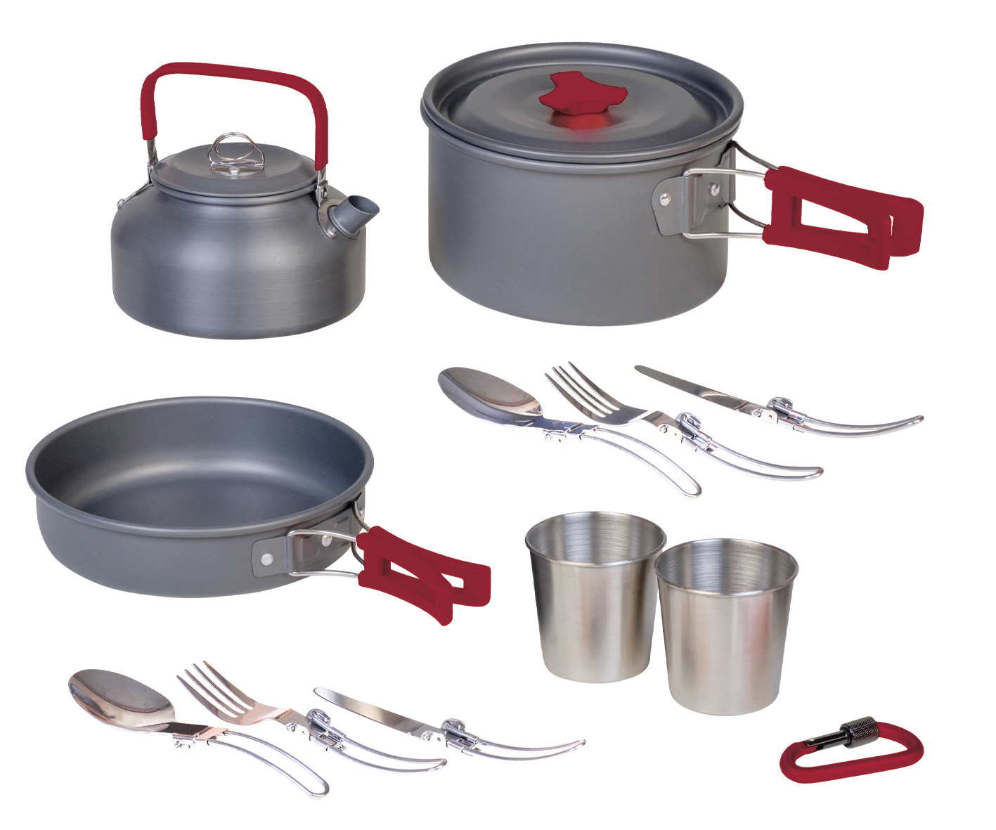 12teiliges Kochgeschirr-Set ideal für Camping und Wandertouren inkl. Besteck und Becher für 2-3 Personen.