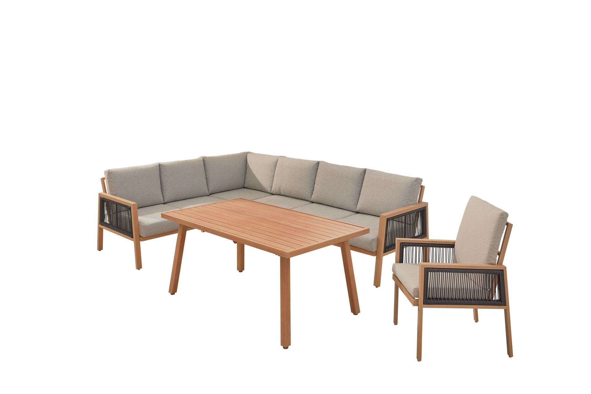 Auch im Alltag überzeugt Solivio durch seine pflegeleichten und wetterfesten Materialien. Der großzügige Tisch mit Aluminiumlatten ergänzt das Ensemble perfekt und bietet ausreichend Platz für Getränke, Snacks oder dekorative Accessoires. So vereint das Eckloungeset Solivio Komfort, Funktionalität und ansprechendes Design auf gelungene Weise.