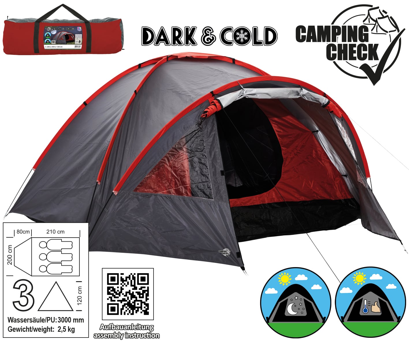 3 Personen Doppeldachzelt “dark & cold” ca. 80+210 x 200 x 120 cm, Wassersäule 3000mm, Polyester 190T