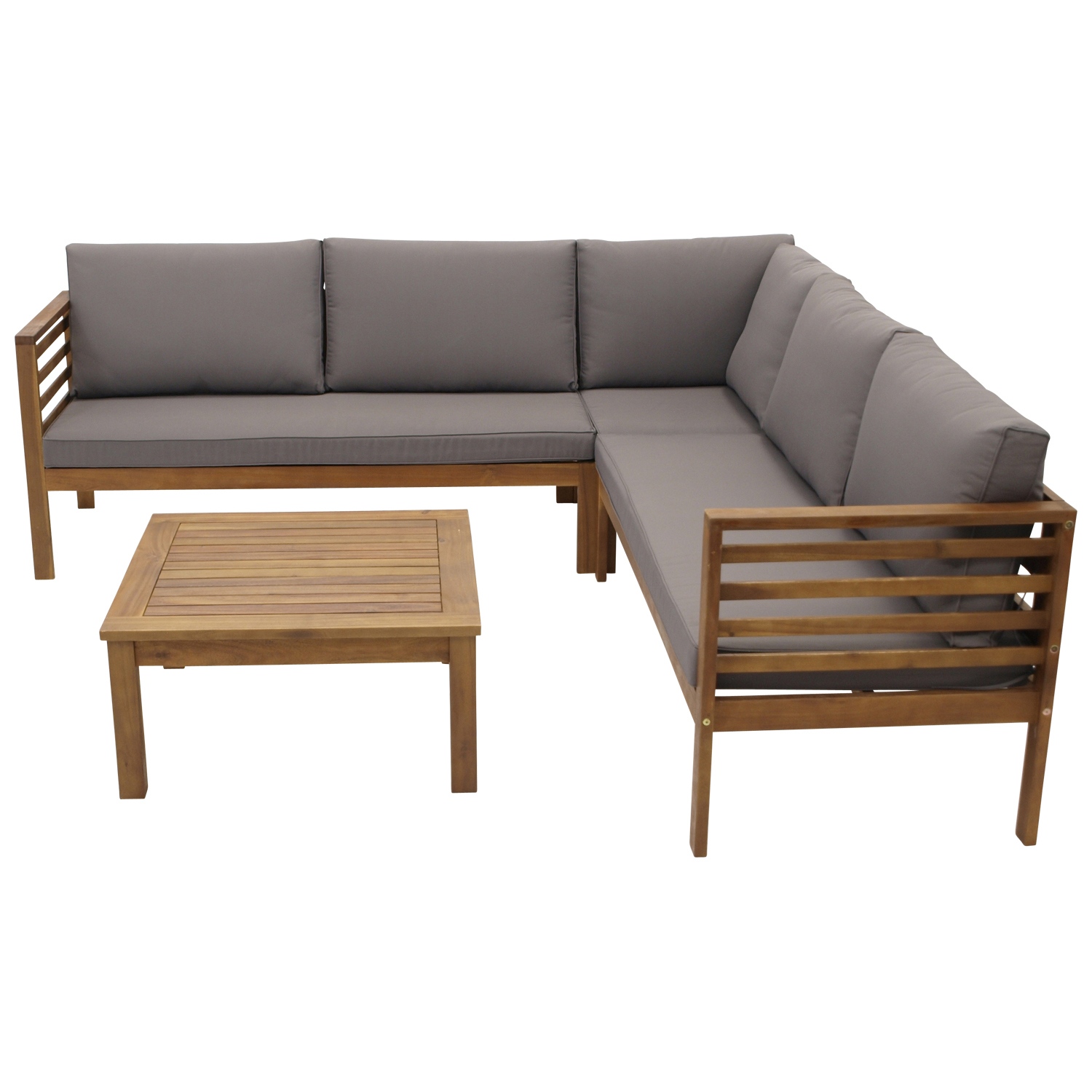 Loungeset mit Ecksofa und Loungetisch, Akazie geölt, mit Loungetisch und Polstern grau. Material Bezüge 100% Polyester. FSC®-zertifiziert.