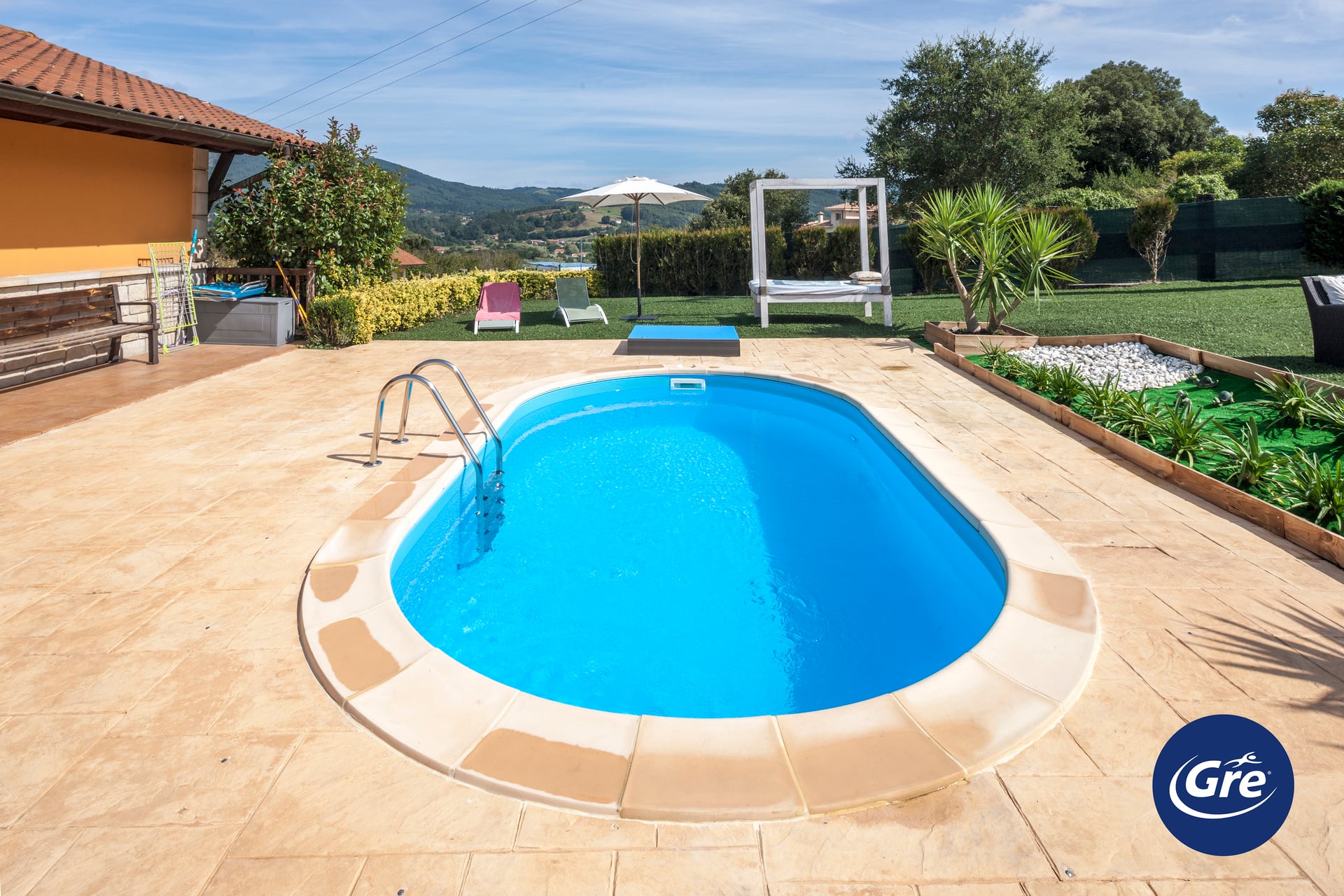 Ovaler Einbaubecken 800 x 400 x 150 cm (Innenmaß) – Stahlwand 70/100 – Blau Keilbiese Innenhülle 75/100 (PIG) – 10m3/h Sandfilter – Edelstahlleiter – Bodenschutzvlies – Breitmaulskimmer – Erdungsanschluss – Rohre – Ø50mm 25 m Schlauch – Kleber