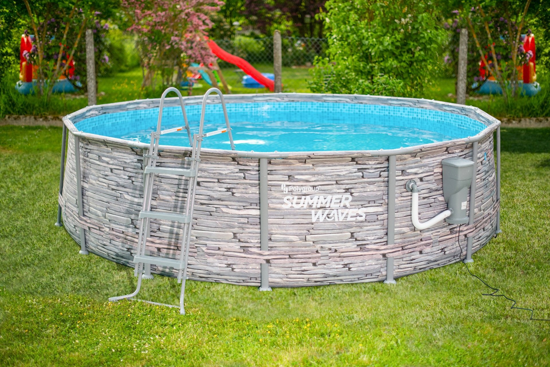 Im Lieferumfang ist außerdem eine leistungsstarke SkimmerPlus 2-in-1-Filterpumpe (12V, 3.785L/h) samt Filterpatrone enthalten. Diese Pumpe entfernt kontinuierlich Oberflächenablagerungen und filtert das Badewasser. So sorgt sie für sauberes Wasser und ausgiebigen Pool-Spaß — den ganzen Sommer lang. Die Pumpe wird einfach an der Poolwand befestigt.