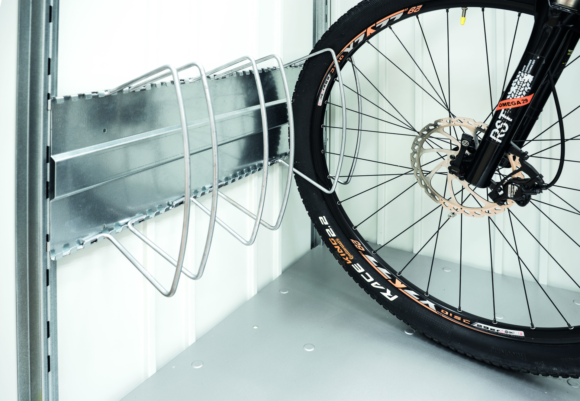 nur passend für StoreMax 190, Optimales Abstellen von Fahrrädern durch verstellbare Klemmbügel, Grundplatte wird in 2 Regalsteher (100 cm) eingehängt, welche im Lieferumfang enthalten sind, Schnelles und einfaches Fixieren der Fahrradreifen, ermöglicht das optimale Abstellen von bis zu 2 Fahrrädern, kann nachträglich einfach eingebaut werden
