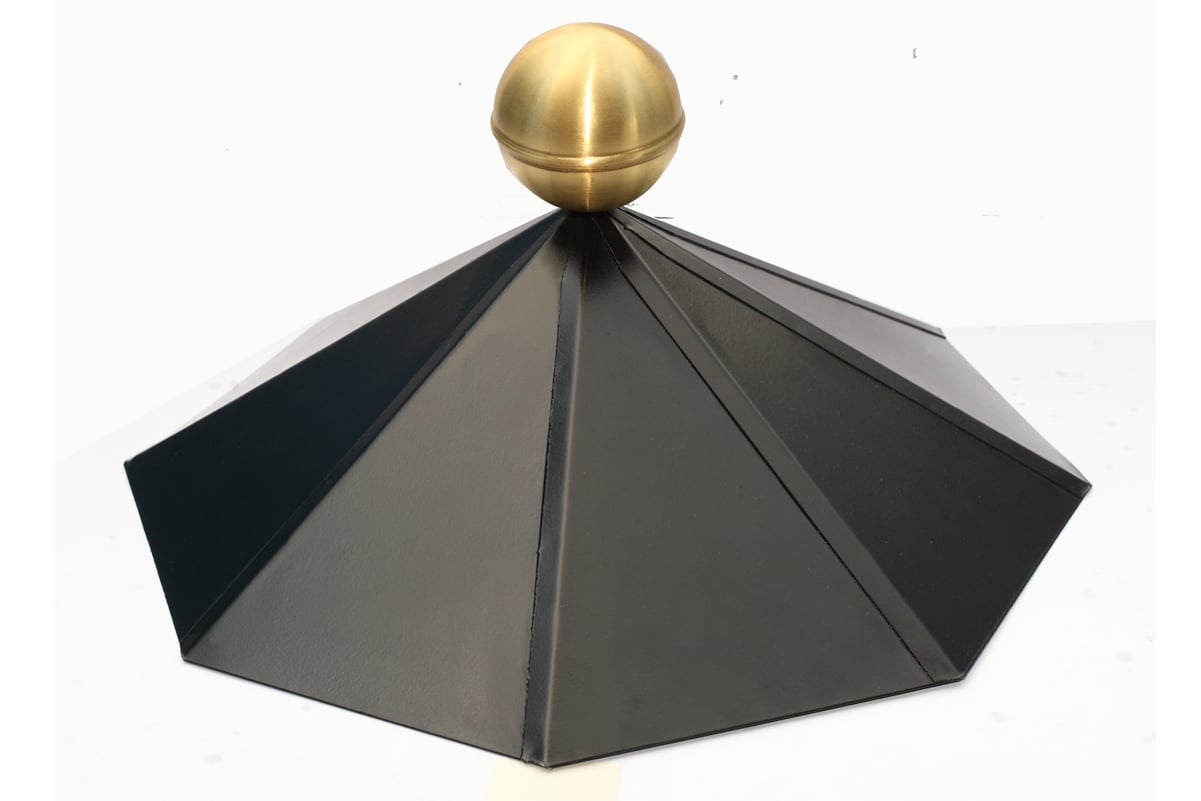 Die Firstkappe aus schwarz lackiertem Stahl mit goldener Messingkugel verschönert Ihren SKAN HOLZ 8-Eck Pavillon nicht nur, sondern dichtet das Dach auch nach oben gegen eindringende Feuchtigkeit ab. Der Durchmesser der Messingkugel beträgt ca. 8 cm.