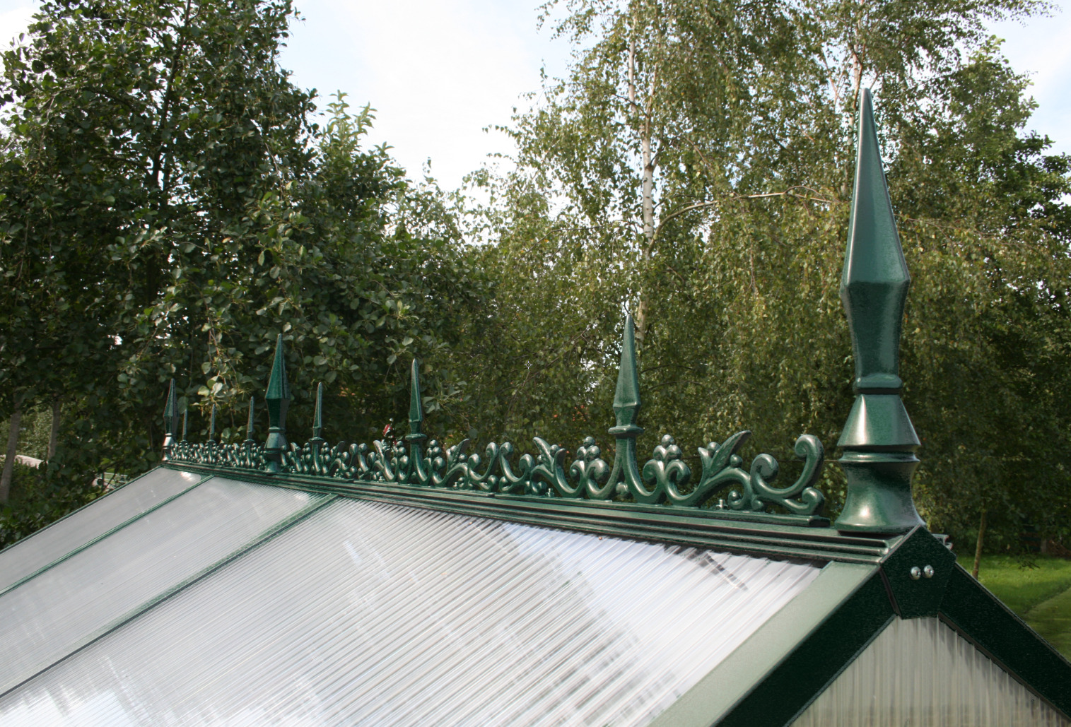 Die Firstverzierung aus Aluminium verleiht Ihrem Gewächshaus einen ganz besonderen Charme. Sie wird auf der ganzen Länge des Firstes Ihres Gewächshauses angebracht und kann auch nachträglich montiert werden. Mit den Zierelementen und Zierspitzen erreichen Sie im Handumdrehen eine Art “viktorianischen Baustil” für Ihr Gewächshaus. Die Firstverzierung ist für alle KGT Gewächshäuser mit Satteldach (außer Rhodo und Callas) geeignet.