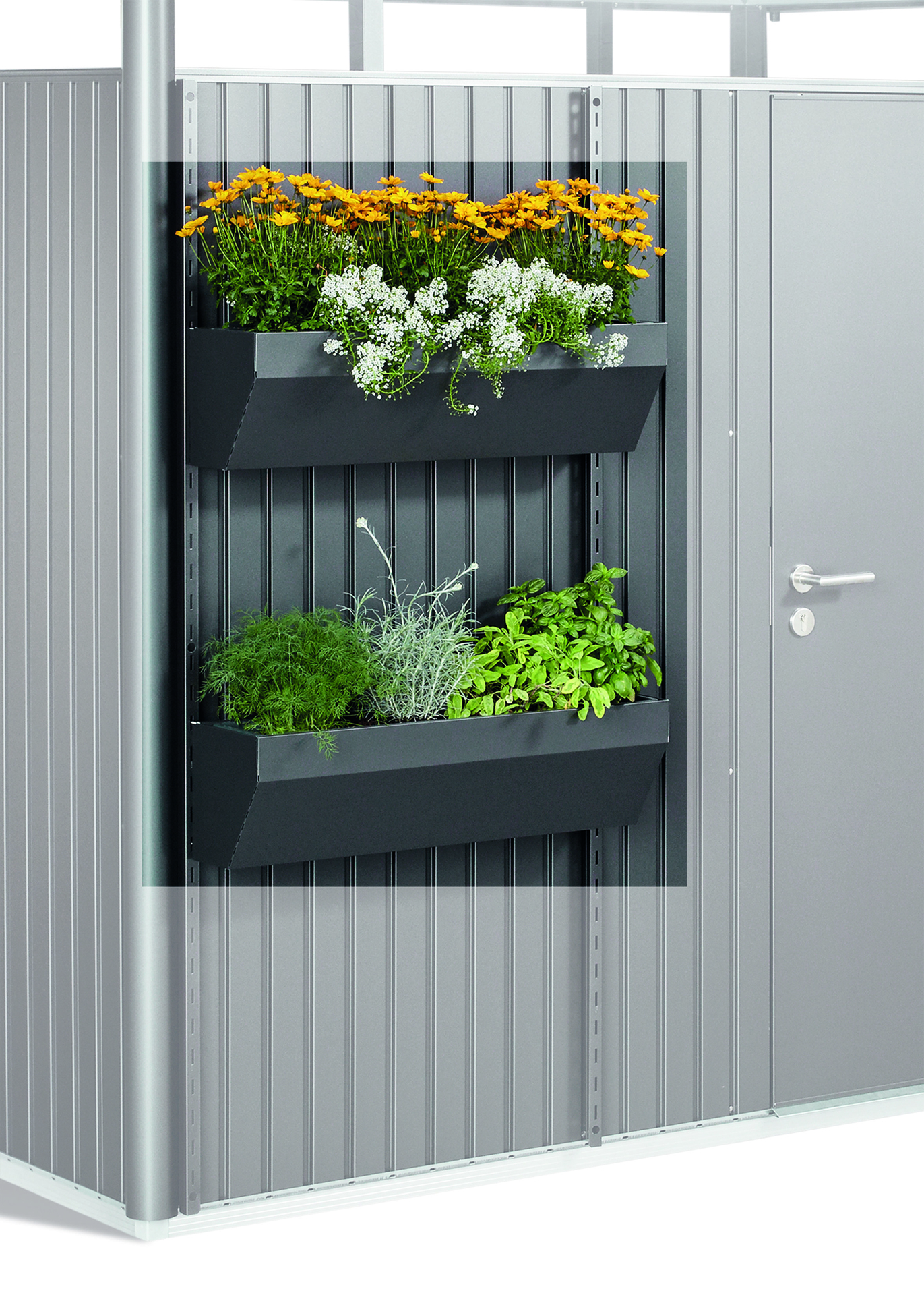 Zwei Steher werden an der Außenwand des Gerätehauses angeschraubt und die Blumenkästen in beliebiger Höhe eingehängt. Kunststoffeinsätze, zur einfacheren Bepflanzung, werden standardmäßig mitgeliefert.