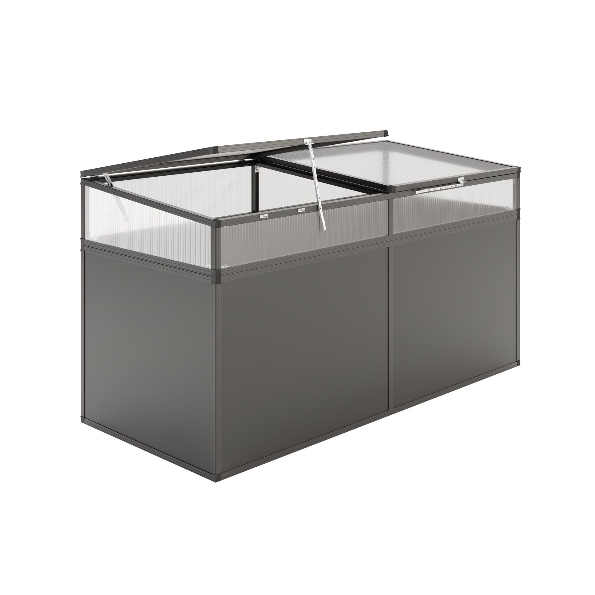 Schützen Sie Ihre jungen Pflanzen mit dem KGT Frühbeetaufsatz 210 in der Farbe anthrazit-grau. Dieses Mini-Gewächshaus ist aus transparenten, UV-geschützten 6 mm ISO-Hohlkammerplatten aus hochbruchfestem Polycarbonat gefertigt. Die Aluminium-Konstruktion ist bei diesem Modell in anthrazit-grau beschichtet und bildet so eine perfekte optische Einheit mit Ihrem grauen Aluminium-Hochbeet. Mit den Abmessungen von 2,05 x 0,99 x 0,32 m (BxTxH) passt der Aufsatz perfekt sowohl auf das Holz-Hochbeet Woody 210 als auch auf das Aluminium-Hochbeet 210. Der Frühbeetaufsatz 210 ist mit zwei praktischen, breiten Öffnungsklappen ausgestattet, die sich um 90° öffnen lassen. Der Handaufsteller ermöglicht verschiedene Aufstellpositionen des Deckels und fungiert gleichzeitig als Verschlussmechanismus. Auf diese Weise gedeihen Ihre Pflanzen in Ihrem Hochbeet sicher und geschützt.