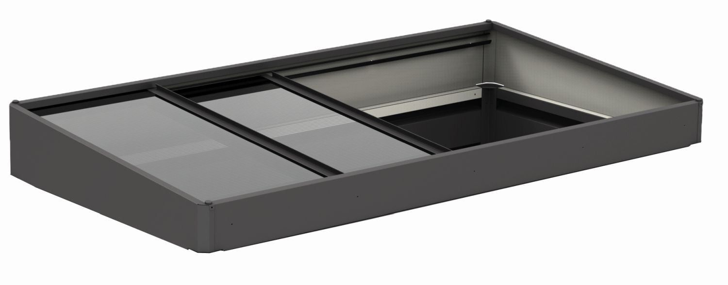 Effizienter Frostschutz und gute Zugänglichkeit durch 4 verschiebbare Doppelstegplatten, die sich leicht entfernen lassen. Der Frühbeetaufsatz ist sturmfest und mit einem Regenwasserablauf ins Innere des HochBeets ausgestattet.