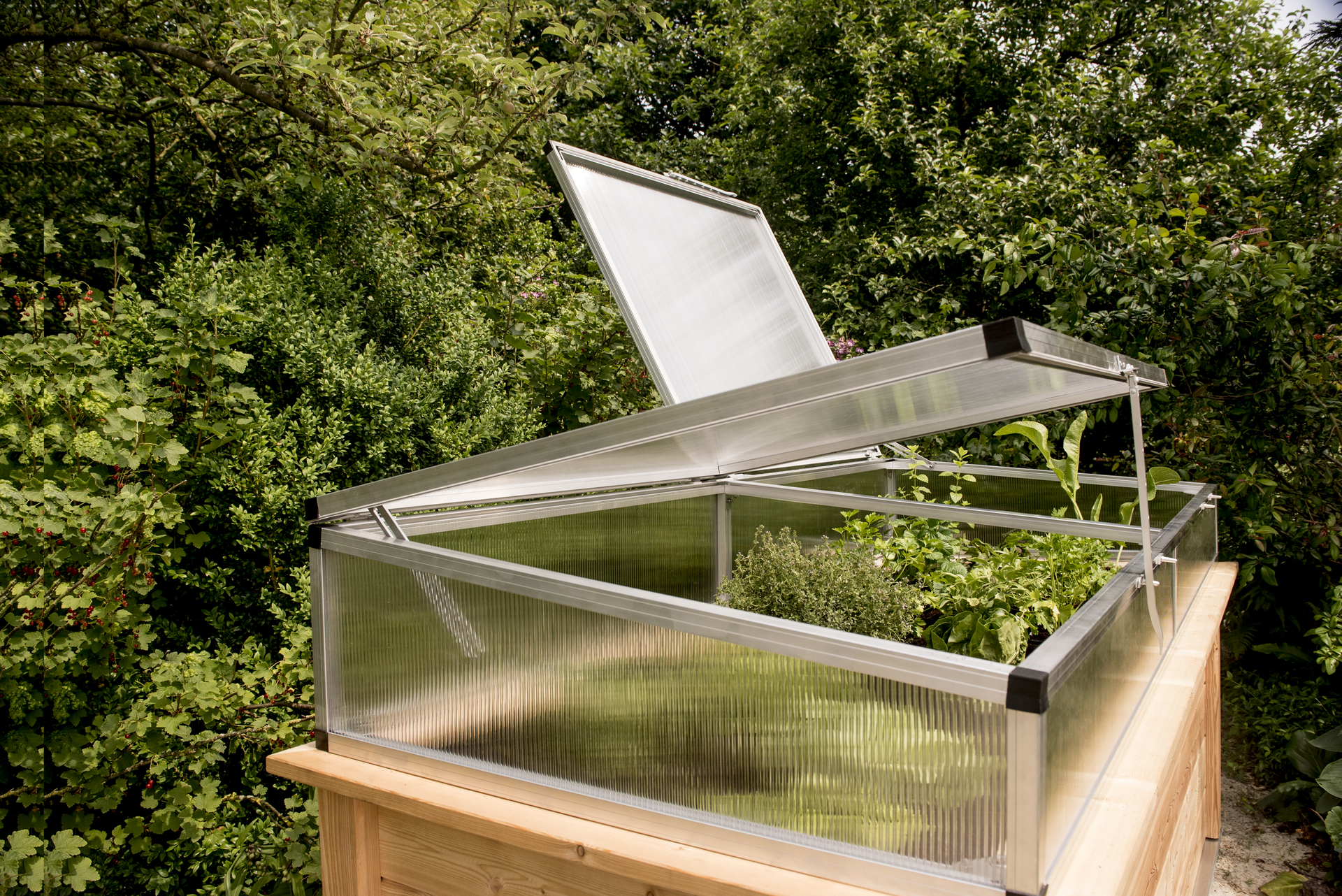 Schützen Sie Ihre jungen Pflanzen mit dem KGT Frühbeetaufsatz 210. Das Mini-Gewächshaus besteht aus transparenten UV-geschützten 6 mm ISO-Hohlkammerplatten aus hochbruchfestem Polycarbonat. Mit den Maßen 2,05 x 0,99 x 0,32 m (BxTxH) passt der Aufsatz perfekt sowohl auf das Holz-Hochbeet Woody 210 als auch das Aluminium-Hochbeet 210. Der Frühbeetaufsatz 210 verfügt über zwei praktische, breite Öffnungsklappen, die sich über 90° öffnen lässt. Der Handaufsteller ermöglicht, den Deckel in verschiedenen Aufstellpositionen zu öffnen und dient gleichzeitig als Verschlussmechanismus. So gedeihen die Pflanzen in Ihrem Hochbeet sicher und geschützt.