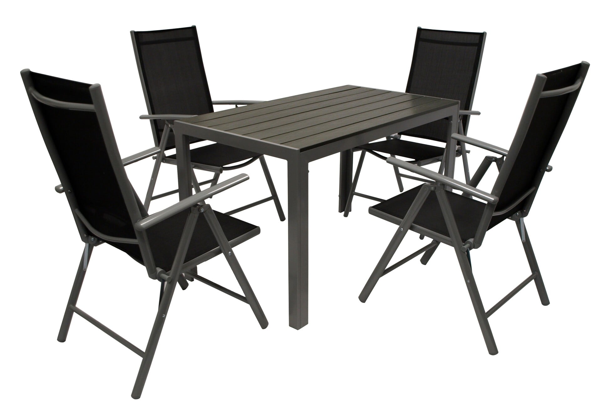 Garnitur 5-teilig (4x Klappsessel mit Armlehnen, 1x Tisch 125x70cm), Gestelle aus Aluminium grau, Bezug Textilbespannung schwarz, Rückenteil Sessel 7-fach verstellbar. Tischplatte aus Kunstholz.