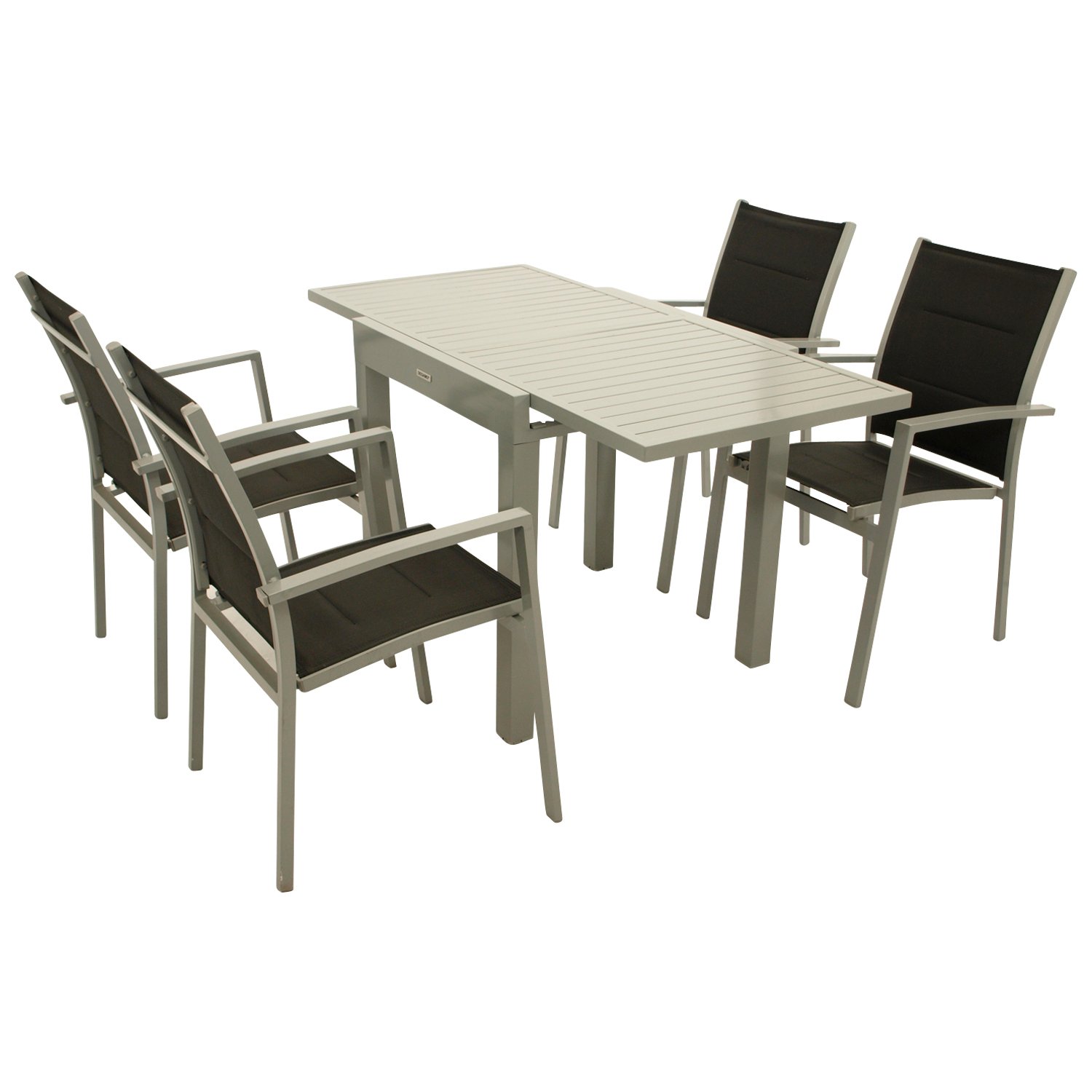 Garnitur 5-teilig, Ausziehtisch + Stapelsessel, Aluminium/Textillehne