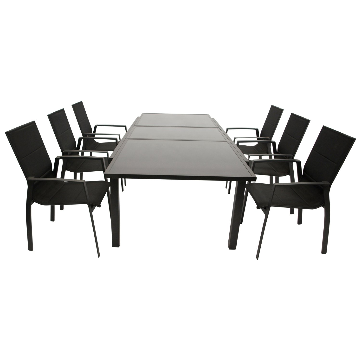 Garnitur 7-teilig (6x Stapelsessel mit Aluminiumgestell schwarz, Bespannung Textillehne schwarz, Ausziehtisch 180/240x100cm, Aluminium + Glas schwarz).