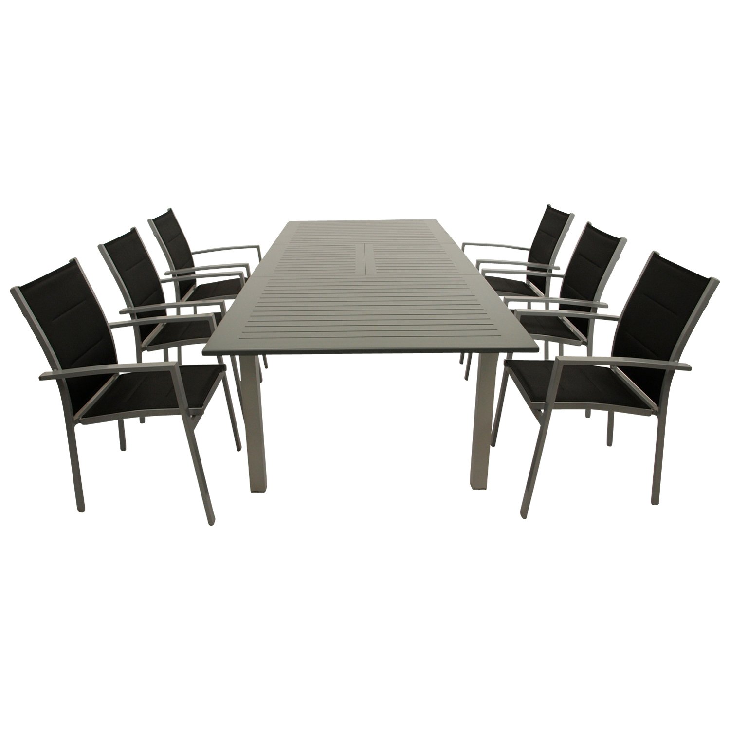 Garnitur 7-teilig, Ausziehtisch + Stapelsessel, Aluminium/Textillehne