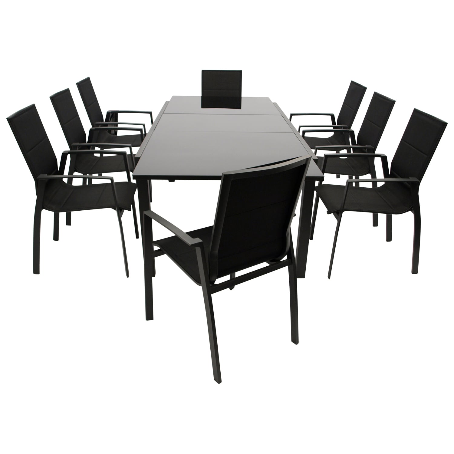 Garnitur 9-teilig (8x Stapelsessel, Aluminium + Kunstgewebe schwarz, 1x Ausziehtisch 180/240x100cm, Aluminium anthrazit + Glas schwarz)